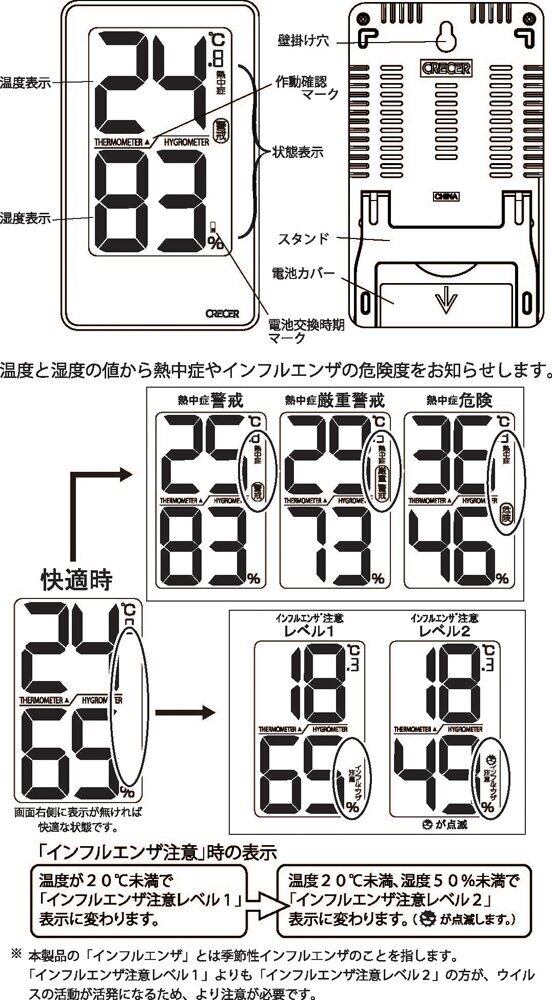 ●デカ文字 サイズ 数字 横40mm 高さ37mm ●熱中症・季節性インフルエンザの警告機能付き ●スマートフォンサイズのコンパクト設計 ●室内の温度・湿度管理に ●熱中症予防に 冷房/除湿の目安に ●インフルエンザ・風邪予防、暖房/加湿の目安に ●電池残量不足時 アイコン表示