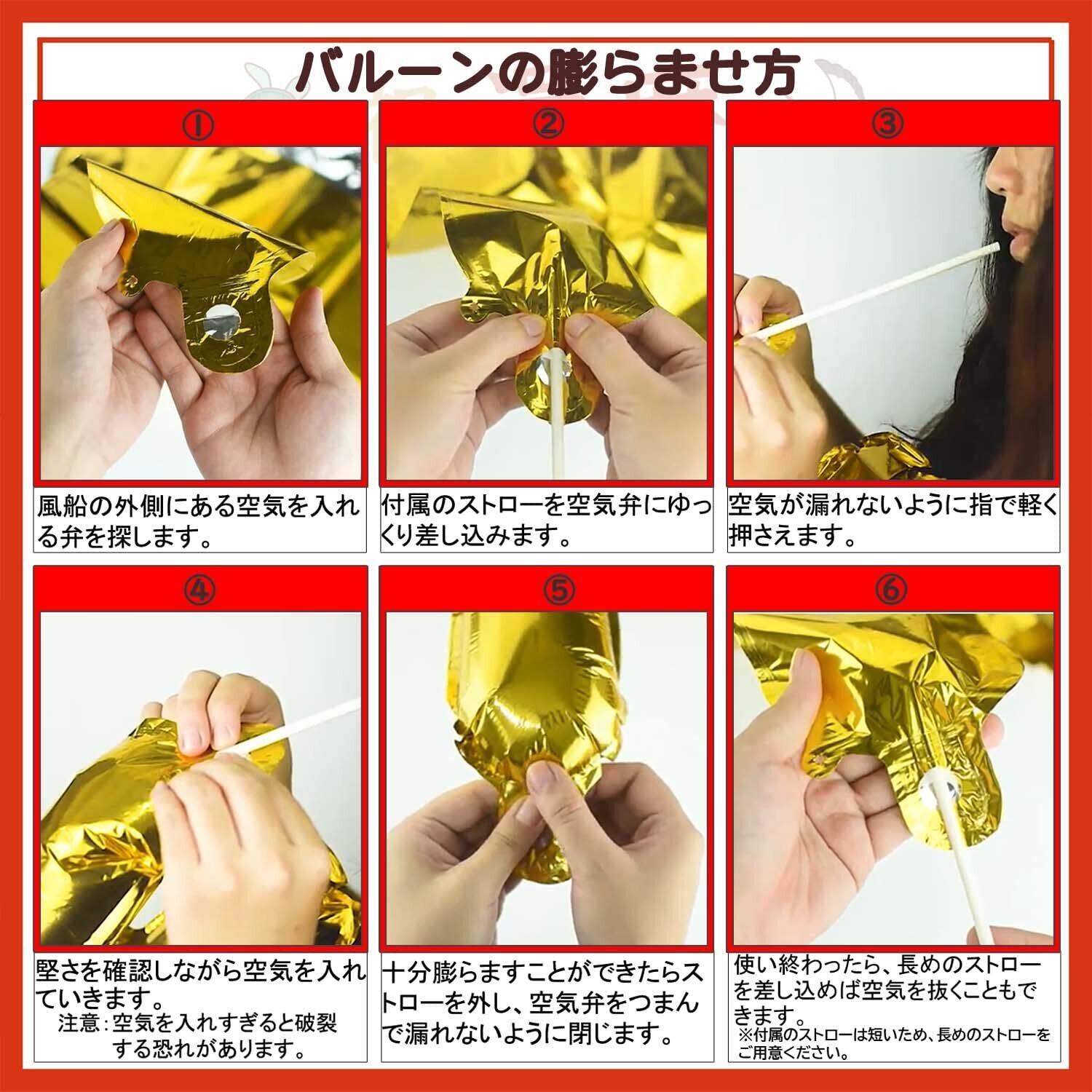 【使い方】各種アルミバルーン及び丸型ゴム風船は、膨らませすぎると破裂する恐れがありますのでご注意ください。また、壁などに貼り付ける場合、素材によっては壁紙等が剥がれる可能性がありますのでご注意ください。