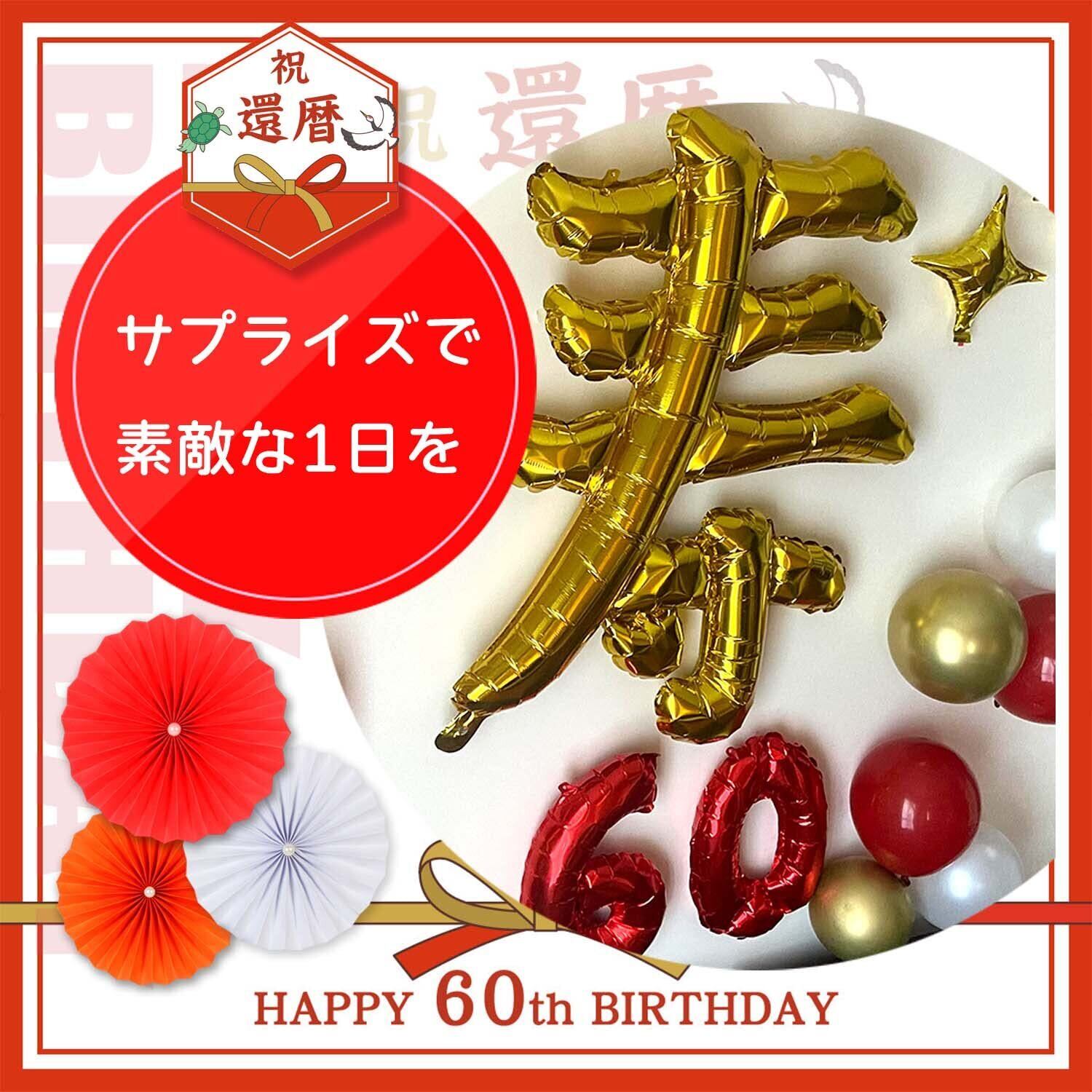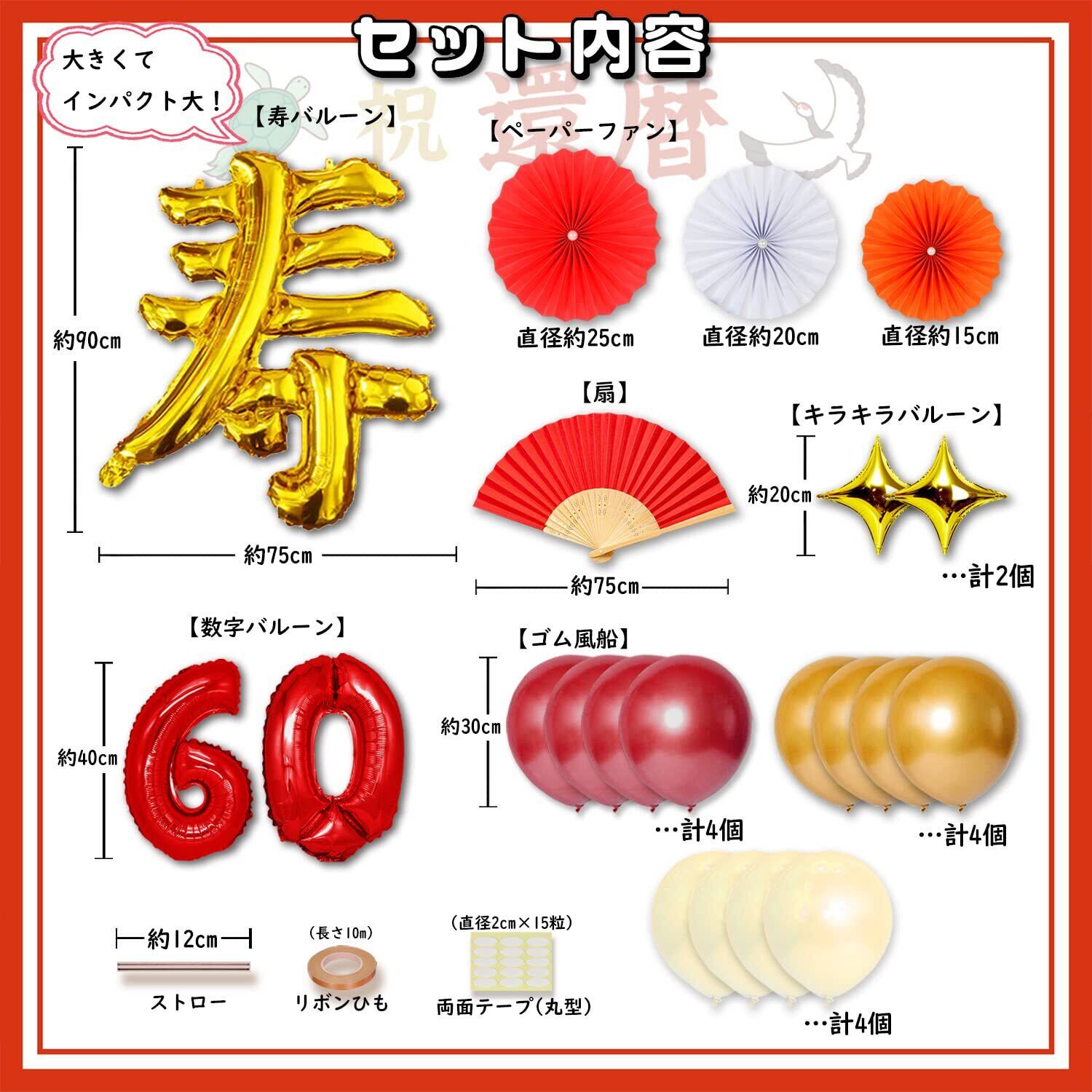 【内容】寿バルーン(約90cm×約75cm※膨らます前の大きさ)、数字バルーン6,0(約40cm)、ペーパーファン大(赤:直径約25cm),中(白:直径約20cm),小(オレンジ:直径約15cm)、丸型ゴム風船(ゴールド×4、赤×4、白×4)、キラキラバルーン×2、扇×1、リボンヒモ×1、丸型両面テープ×15粒、ストロー×2、取扱説明書。
