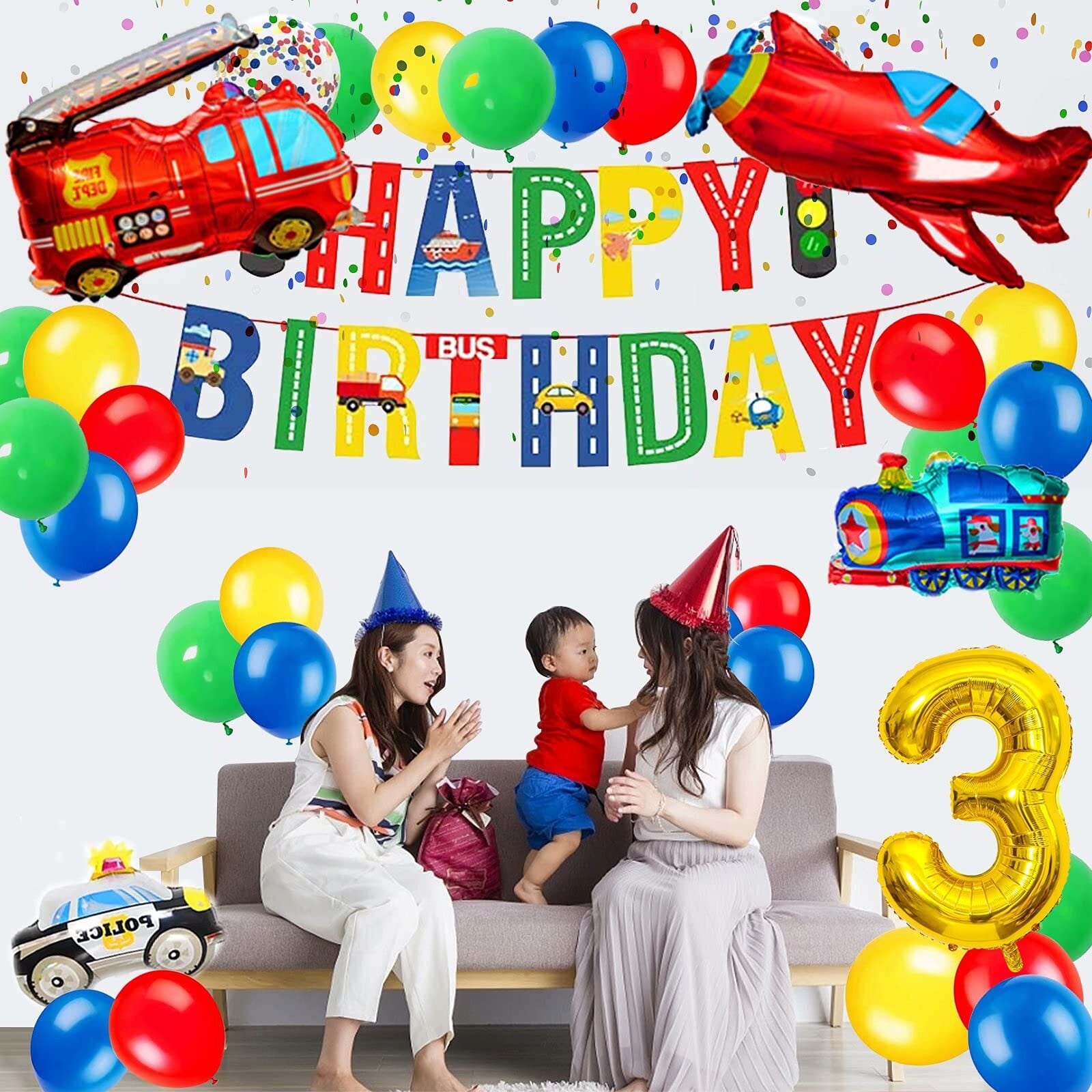 「誕生日 バルーンセットの内容」①81cm数字バルーンx1 ②25.4cmゴム風船x24(赤色、青色、黄色、緑色) ③アルミ風船x4(飛行機*1、列車*1、パトロールカー*1、消防車*1) ④「HAPPY BIRTHDAY」バナーx1 ⑤リボンx1 ⑥ドットグルーx1 男の子が大好きな車テーマ誕生日 飾り付け セット、素敵なバースデー 飾り!