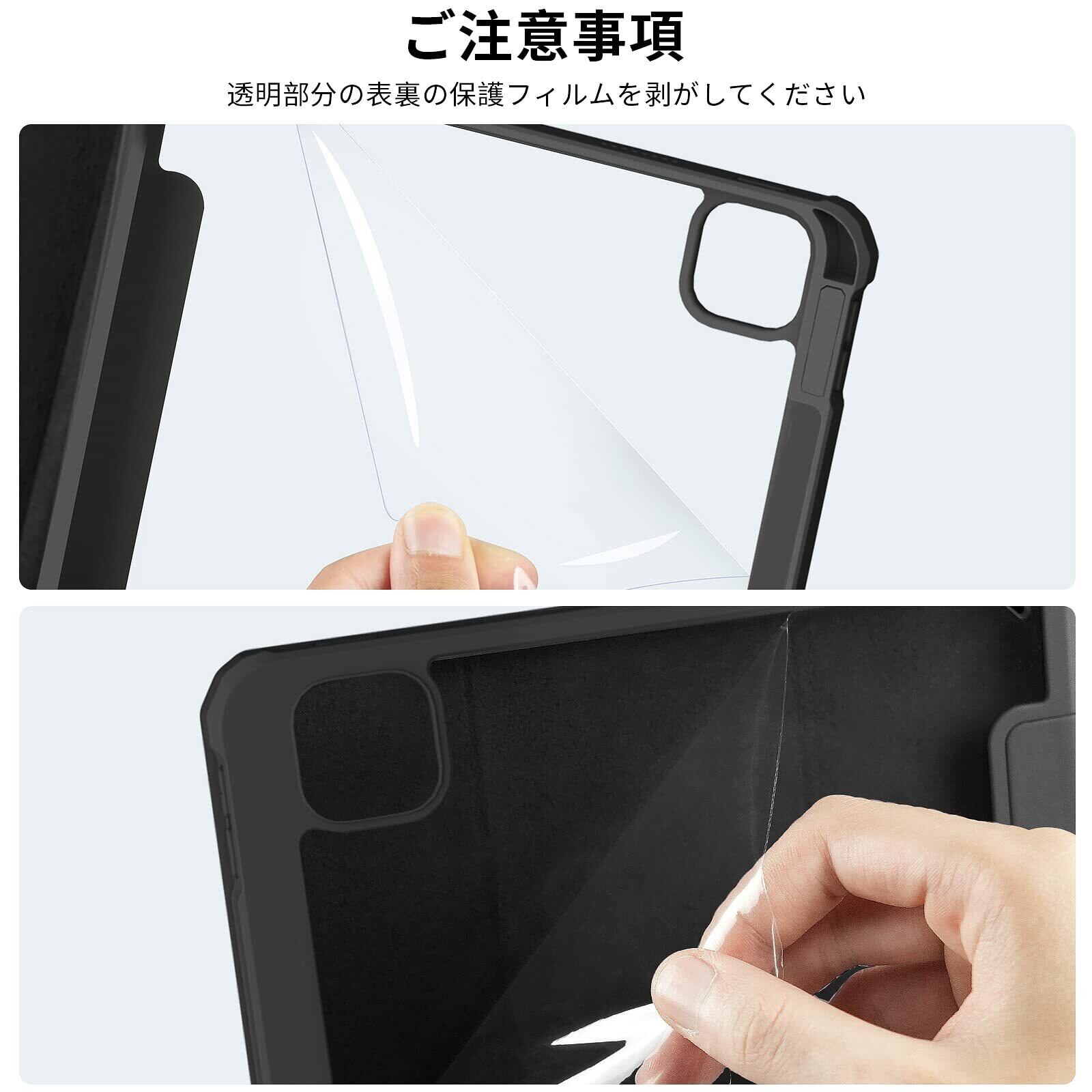 【材質&外観】ケースの表面はPUレザー素材を利用して、軽量、超薄を備えます。透明バックカバーの枠は柔軟な TPUを採用して、取り付けも簡単にできます。軽量のソフトシェル設計により、シェルの体積を増やすことなく保護を向上できます。電源ボタン、音量ボタン、スピーカー穴等、iPadを隅々までカバーし、非常に優れた保護力を発揮。(注:透明部分の表裏の保護フィルムを剥がしてください)