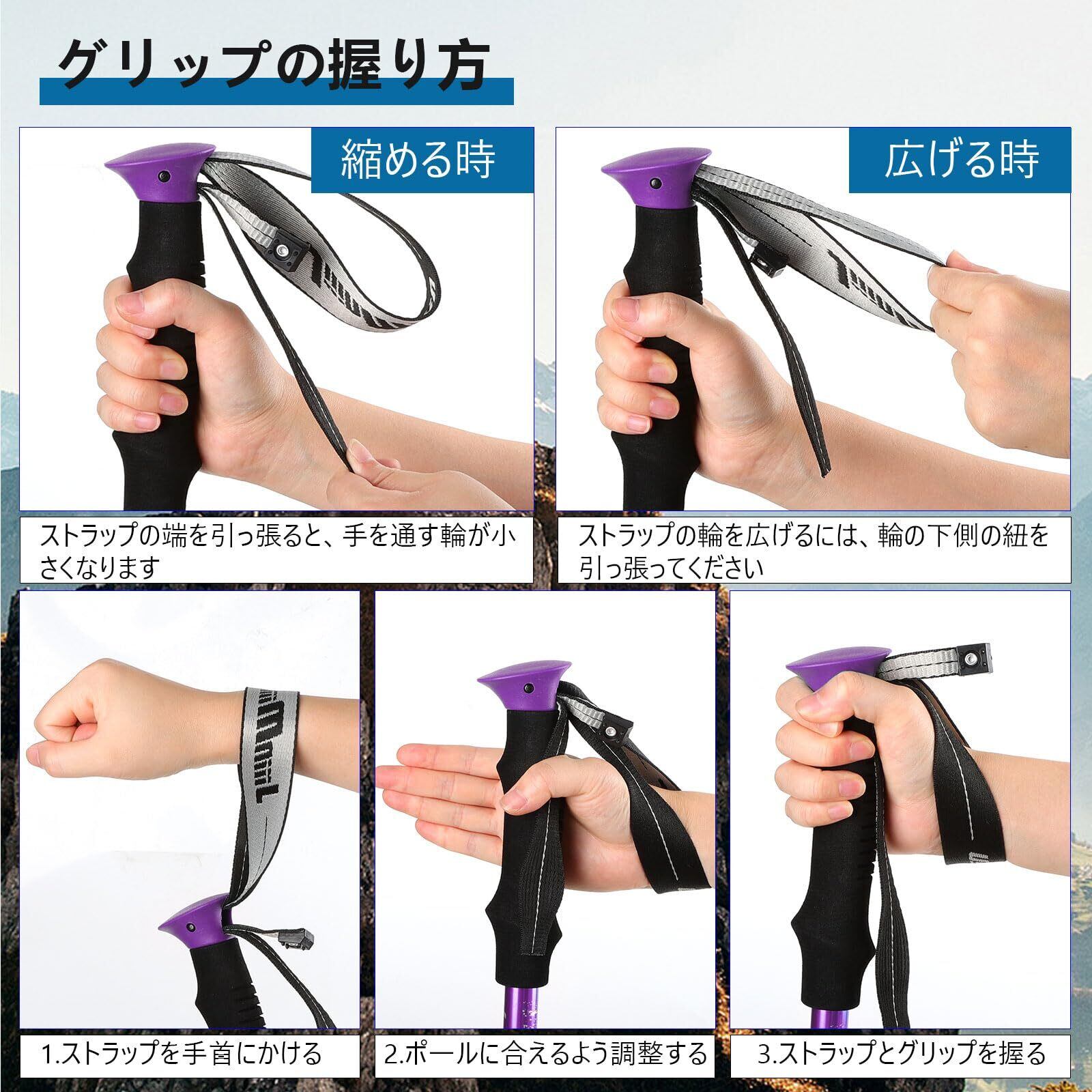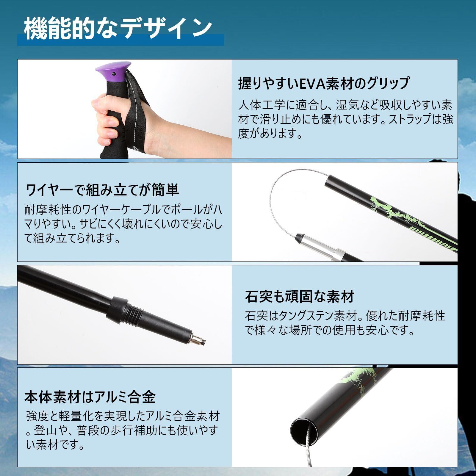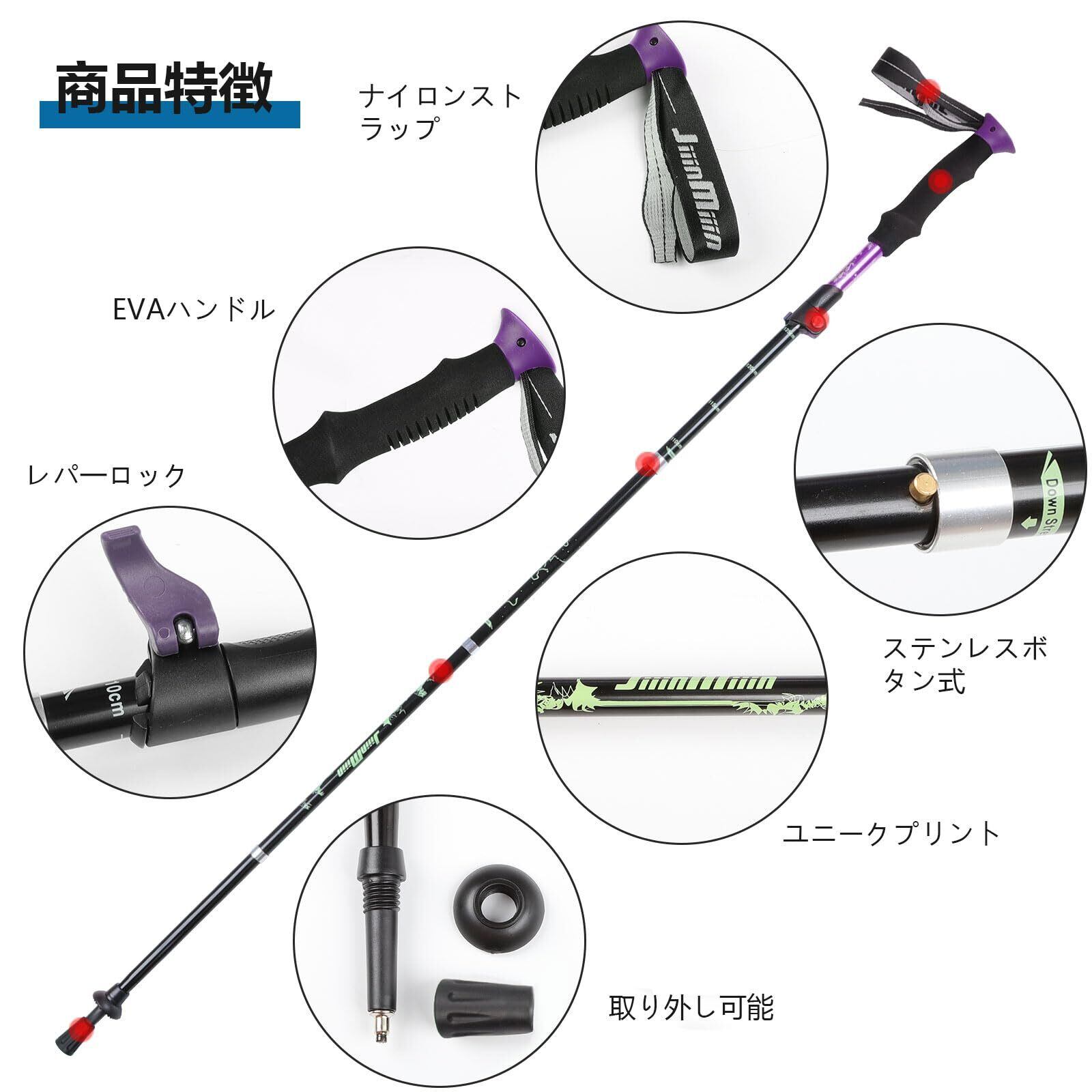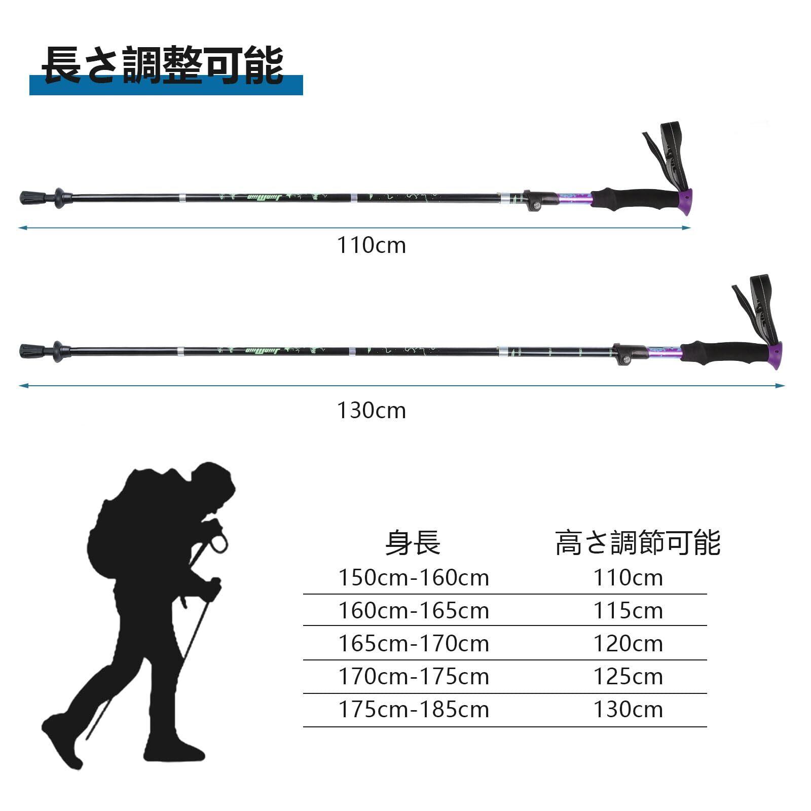 自在な長さ調整:杖身の長さを 110cm から 130cm まで自由に調整できます。身長や体型に関係なく、あなたに最適な長さを見つけることができます。また、山道の傾斜や地形の変化にも柔軟に対応し、安定したサポートを提供します。