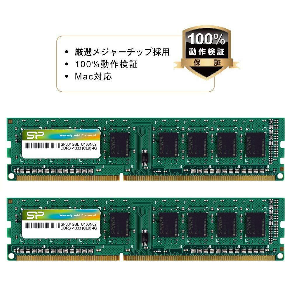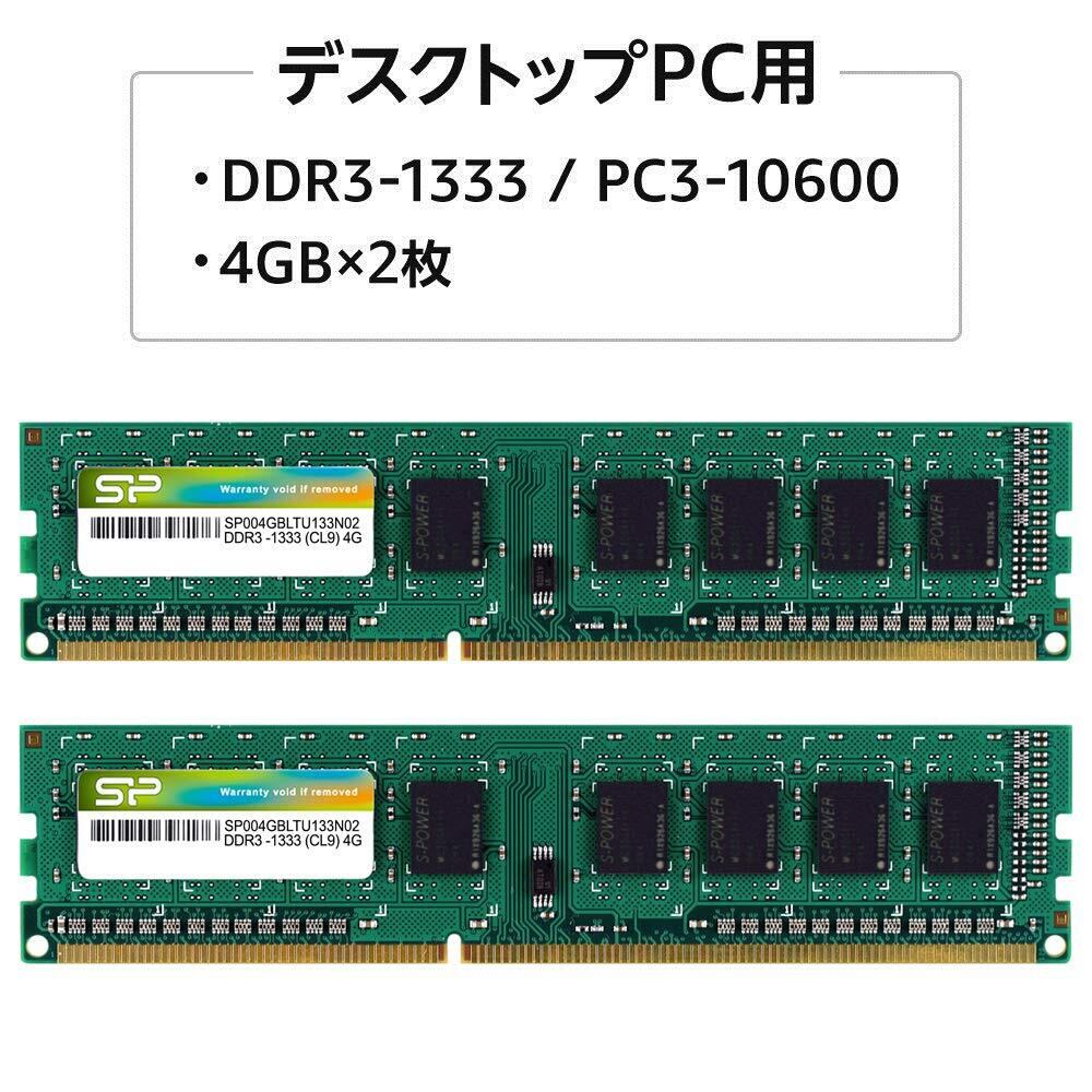 SP Silicon Powerシリコンパワー デスクトップPC用メモリ 240Pin DIMM DDR3-1333 PC3-10600 4GB×2枚 SP008GBLTU133N22