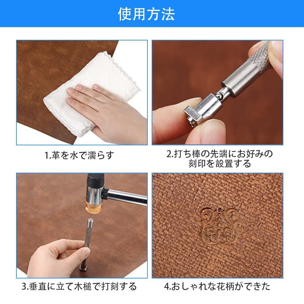 ■【使用方法】:セットには、打ち棒1本が付属しており、打ち棒の先端にお好みの刻印を設置し、水で濡らせた皮革に、垂直に立て木槌で打刻するだけ完成します。注意:大理石やゴム板など平坦で安定した土台の上で行うとブレにくく、パターンを鮮明に打刻することができます。初心者でも使いやすいです。
