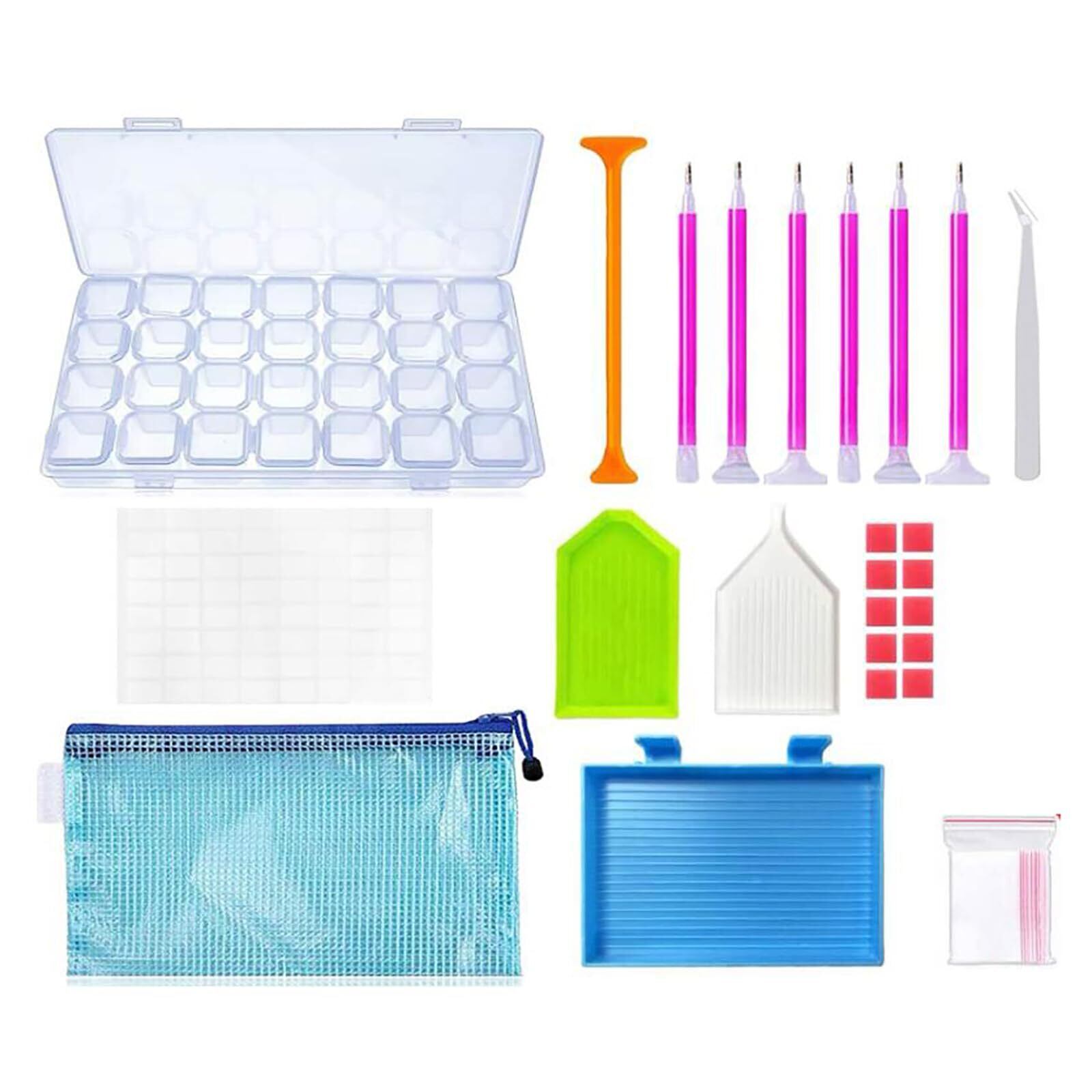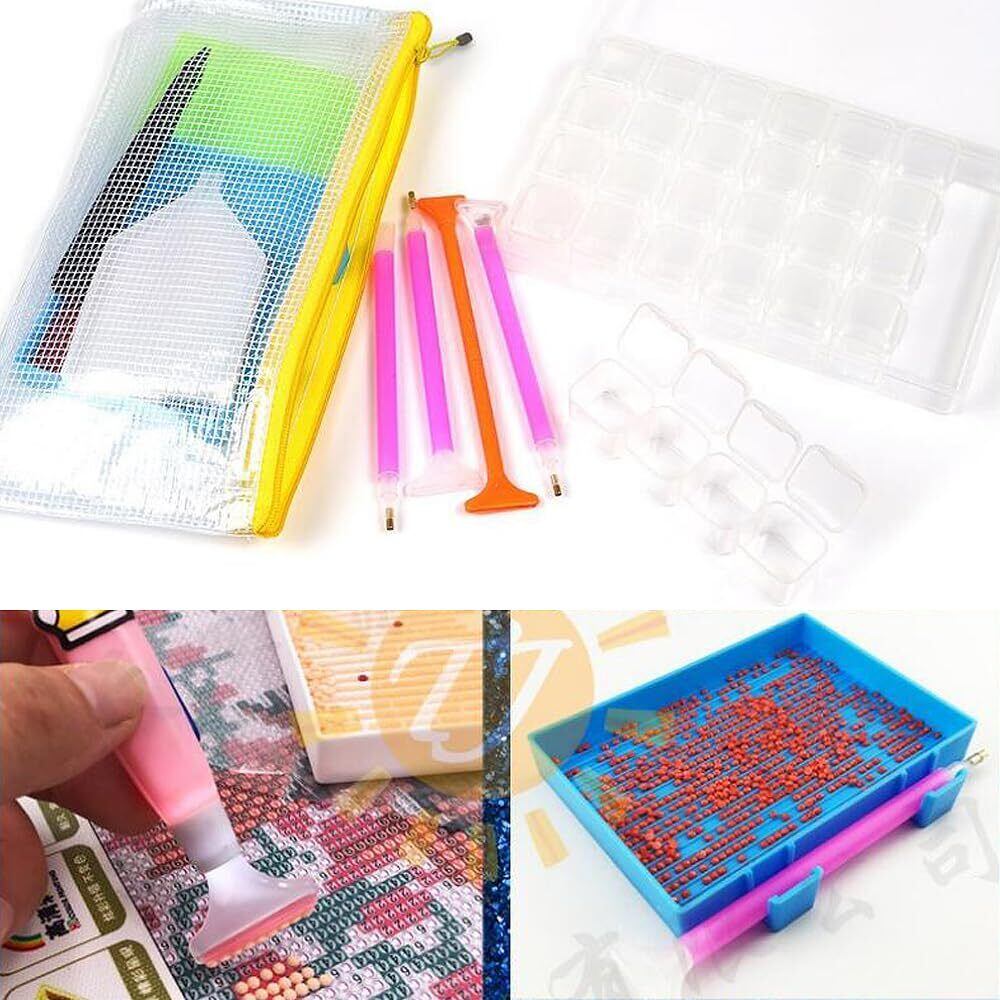 【パッケージ内容】ダイヤモンドペン6、収納ケース(28マス)1、ドリル皿3、収納袋1、ラベルステッカー1、グルー10、チャック付ポリ袋20、ピンセット1、オレンジ色の双頭ドリルペン*1、合計44点セット。