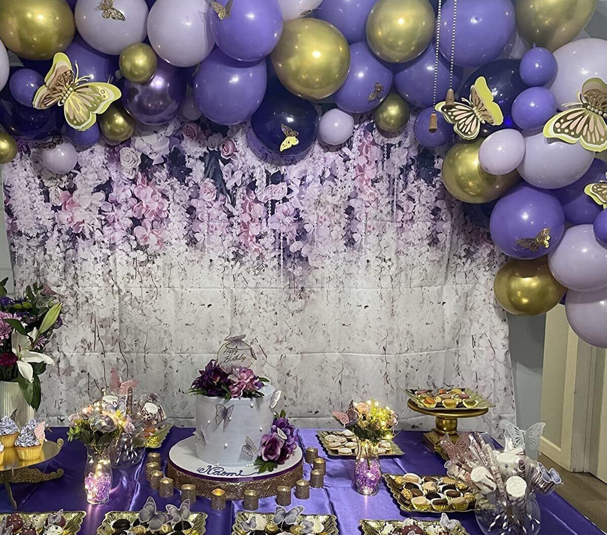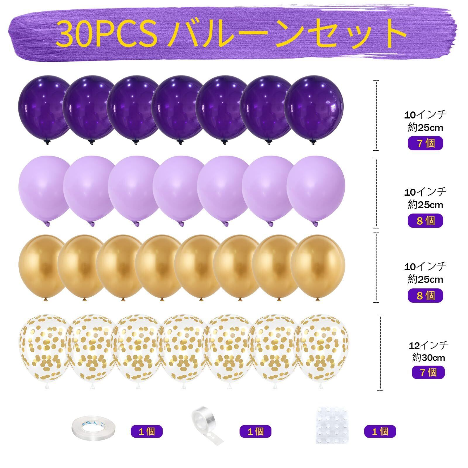 【バルーンセット内容】バルーン30個(カラー:パープル、ゴールド)、バルーンチェーン1巻、粘着シール1枚、リボン1巻。
