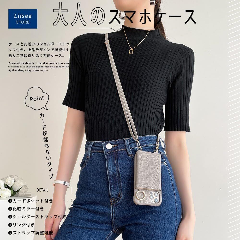 iphone12/iphone12 pro スマホケース ショルダー タイプ 携帯ケース 手帳型 背面カード収納 鏡付き 肩掛け 斜めかけ リング付き ミラー付き 背面ポケット 財布付き マグネットなし レザー ストラップ付き