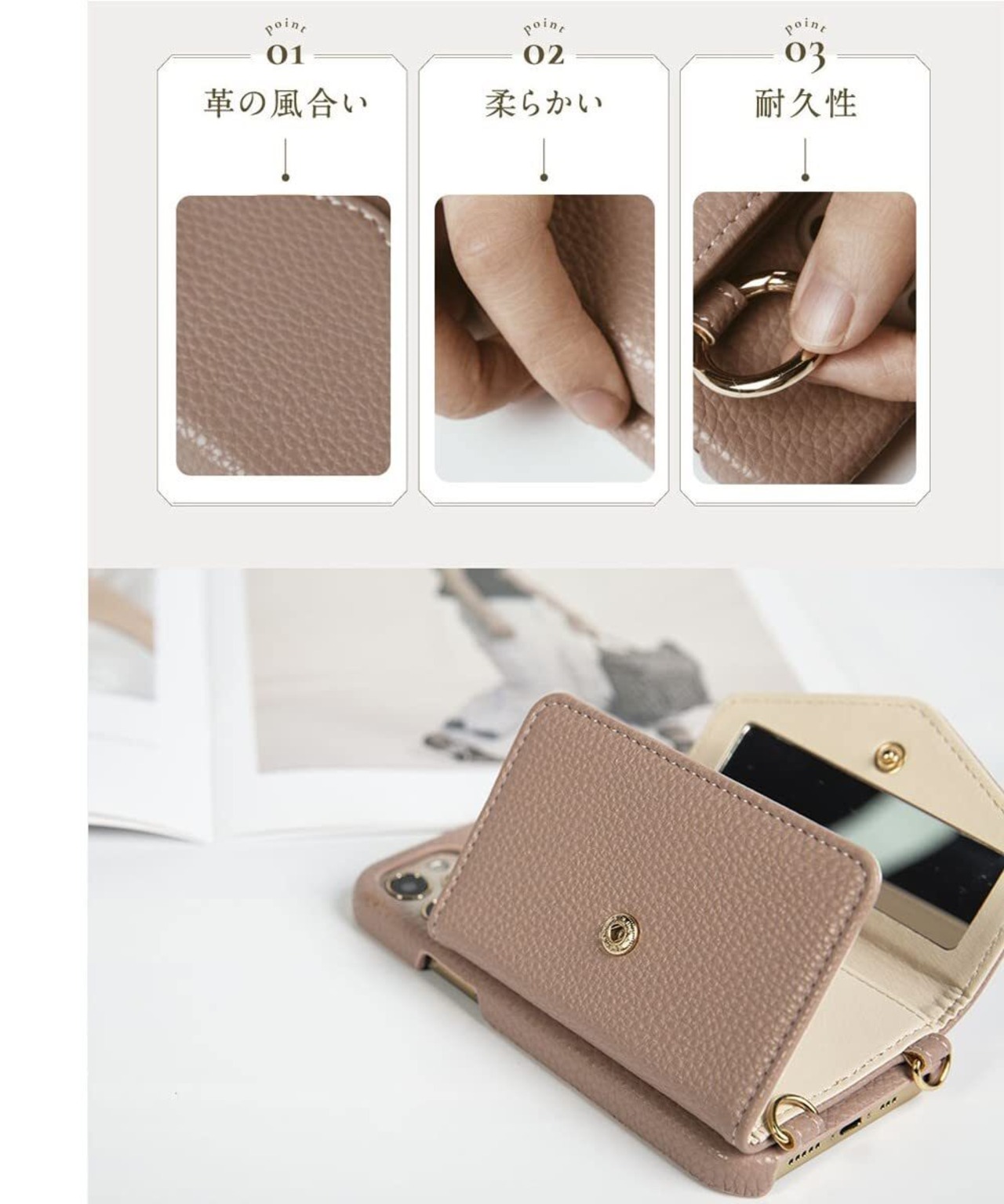 スタント機能:カードホルダー付きますので、カード収納だけではなく、スタント機能も備えてます。