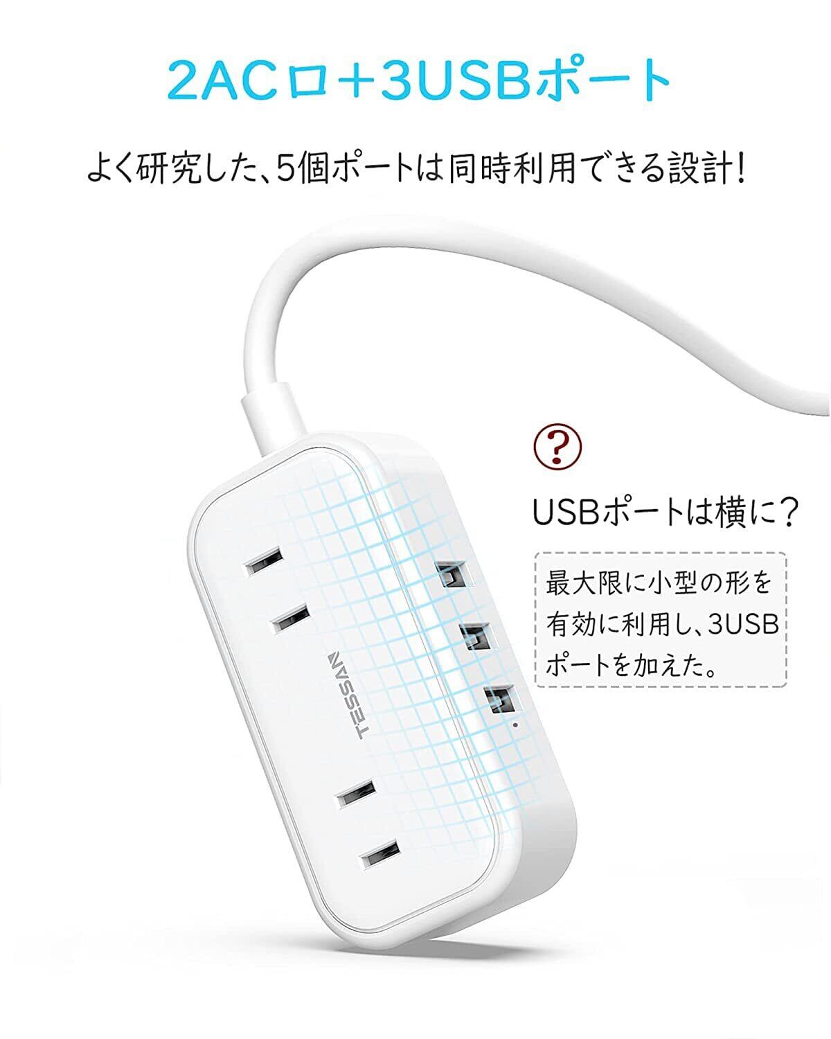 TESSAN 延長コード 1.5m 電源タップ たこあしコンセント テーブルタップ ホワイト AC2個 3USBポート 小型 タコ足配線 マルチ oa