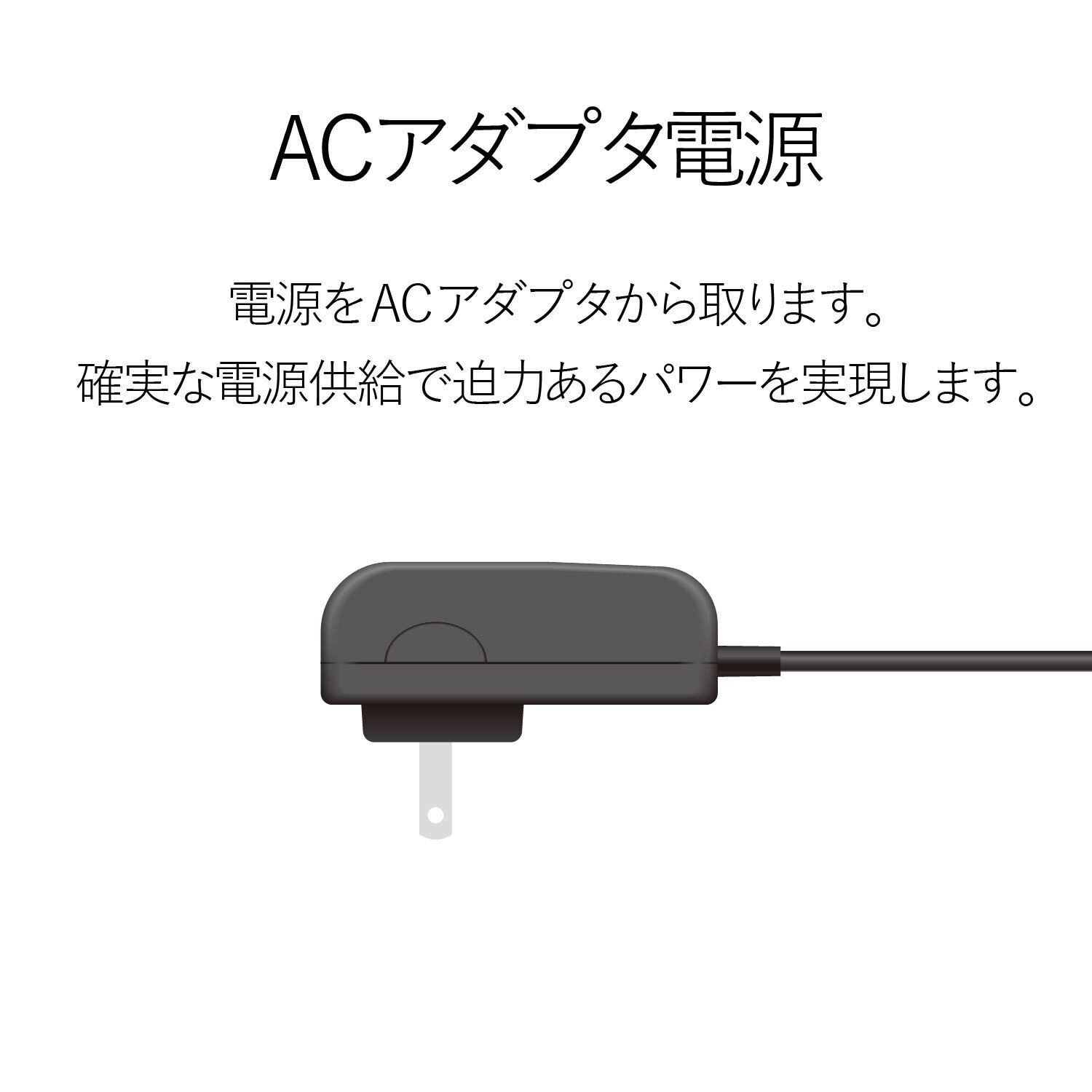 家庭用電源に接続するACアダプタータイプです。ACアダプター給電により、高音質・高出力サウンドを実現します。