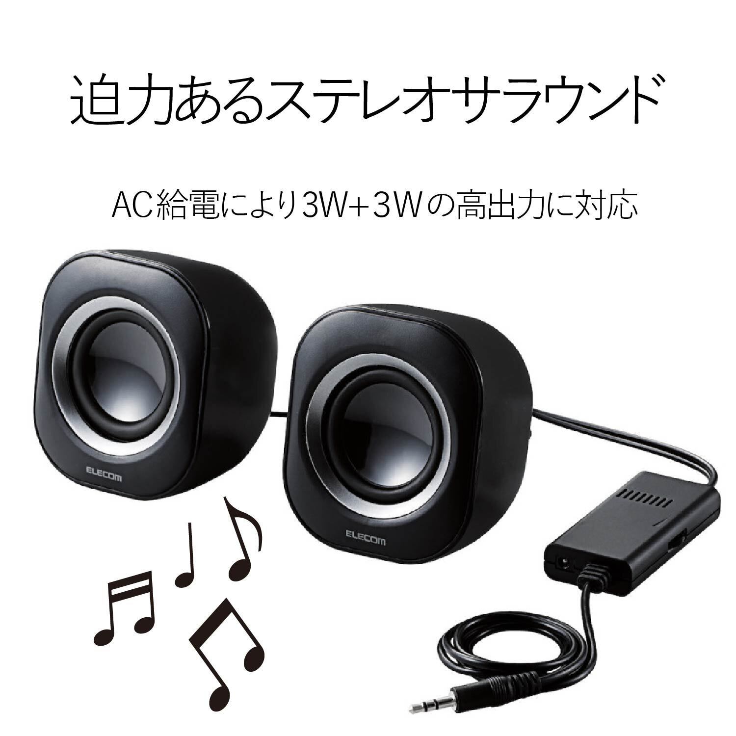 ■実効最大出力6.0Wの2.0chステレオスピーカです。家庭用AC電源からの給電で、ステレオサウンドを手軽にお楽しみいただけます。 ■家庭用電源に接続するACアダプタータイプです。ACアダプター給電により、高音質・高出力サウンドを実現します。 ■汎用性の高い3.5mmステレオミニジャック接続の入力タイプなので、パソコンだけでなく様々な機器に接続可能です。 ■φ50mmの丸型フルレンジドライバを採用し、バランスのよい安定したサウンドを実現します。