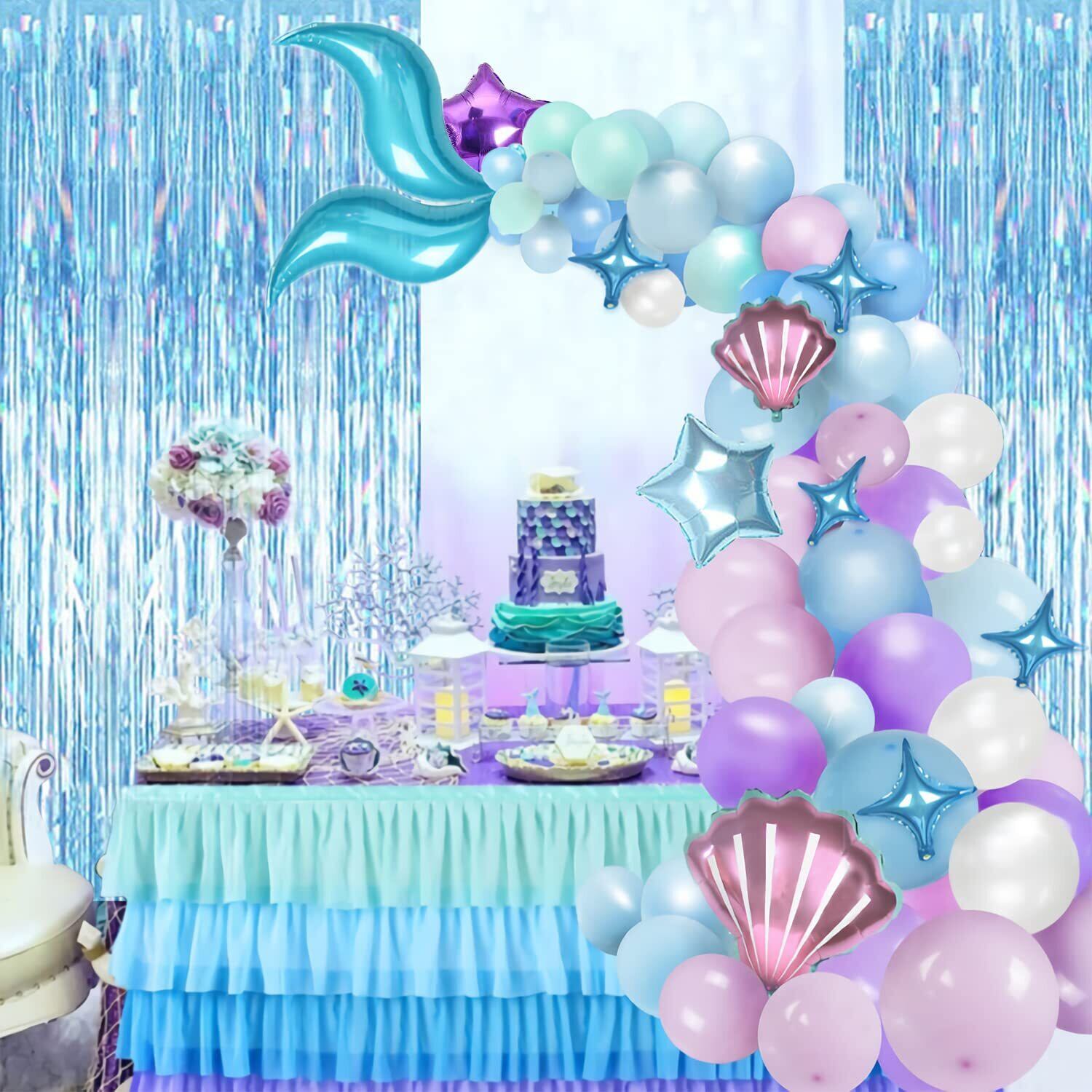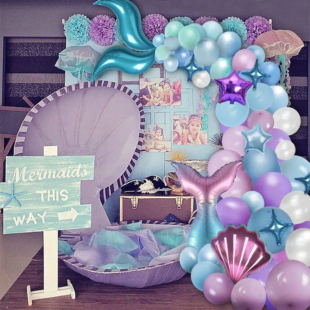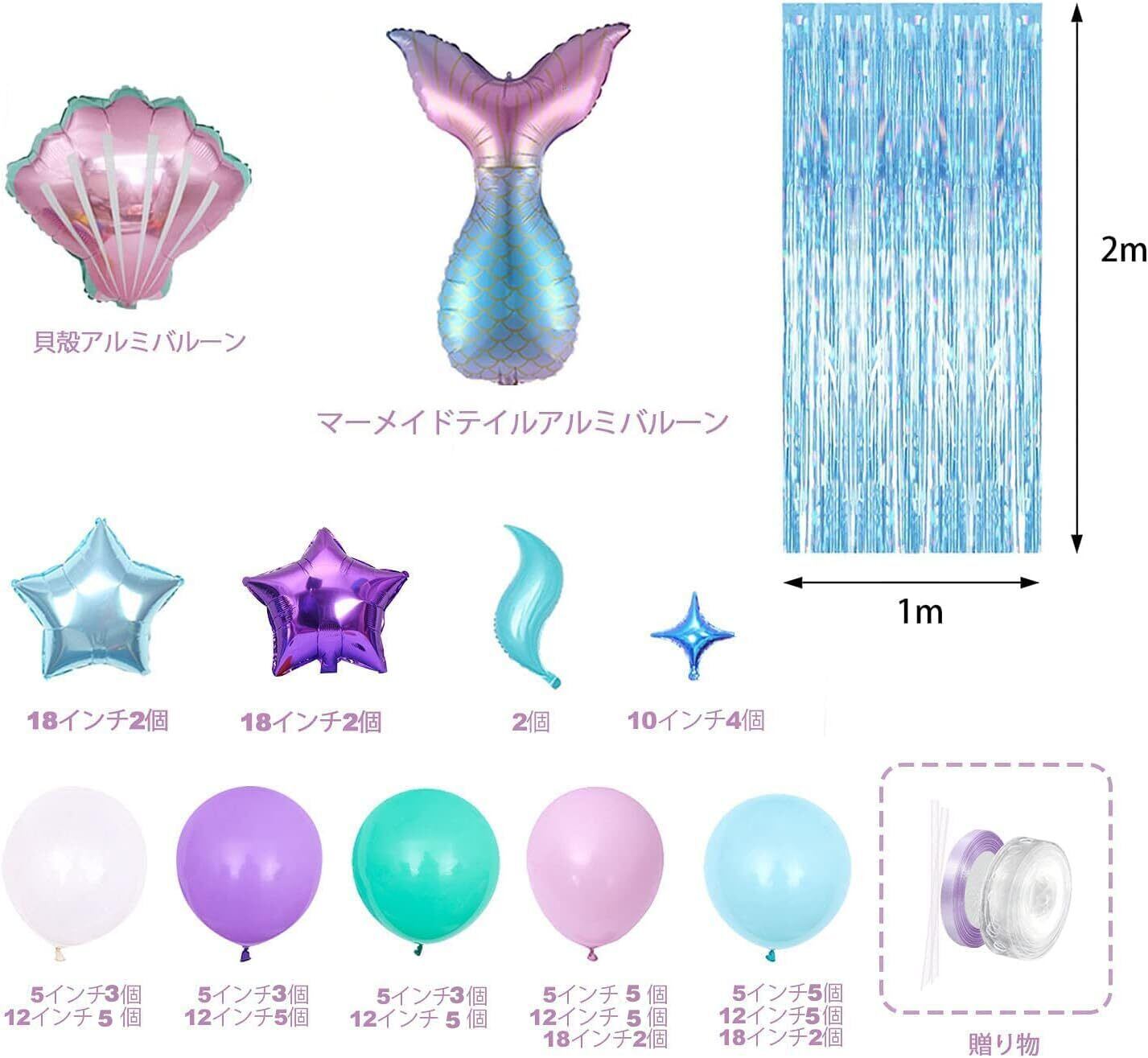 【商品セット内容】①アルミバルーン×10個(マーメイドテイル*1、貝殻*1、四隅星*4、五芒星*4) ②マーメイドテイルバルーン×2個 ③5インチゴム風船×19個(薄紫*5、青*5、紫*3、緑*3、透明*3) ④12インチゴム風船×25個(透明*5、紫*5、緑*5、薄紫*5、青*5) ⑤18インチゴム風船×4個(薄紫*2、青*2) ⑥カーテン(1×2m) ⑦リボン ⑧バルーンチェーン
