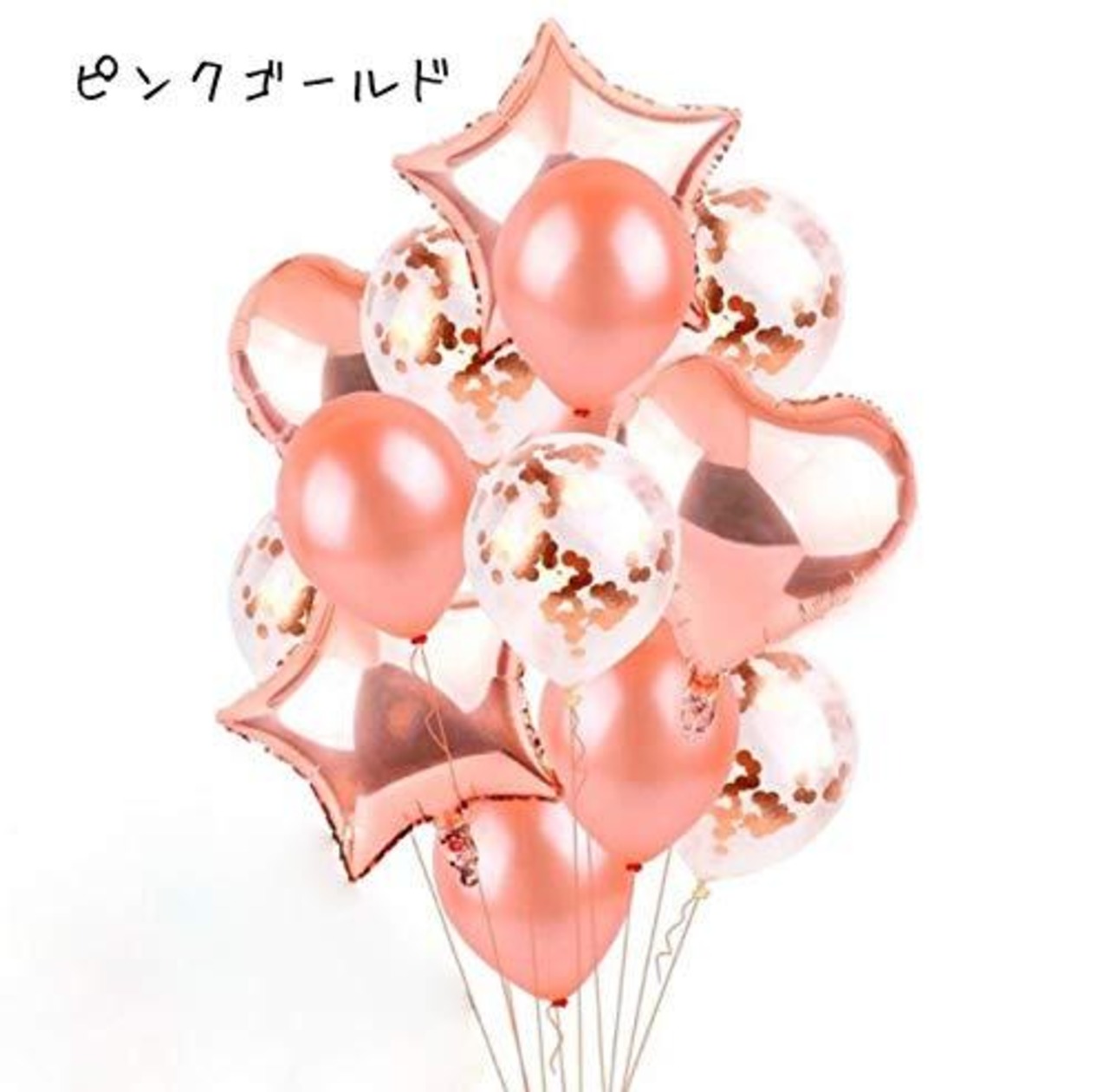 付属コンポーネント 4種類ミックス:18寸 ハート アルミバルーン 2個、18寸 星 アルミバルーン 2個、12寸 紙吹雪入り風船 5個、12寸 風船 5個、紐 1巻