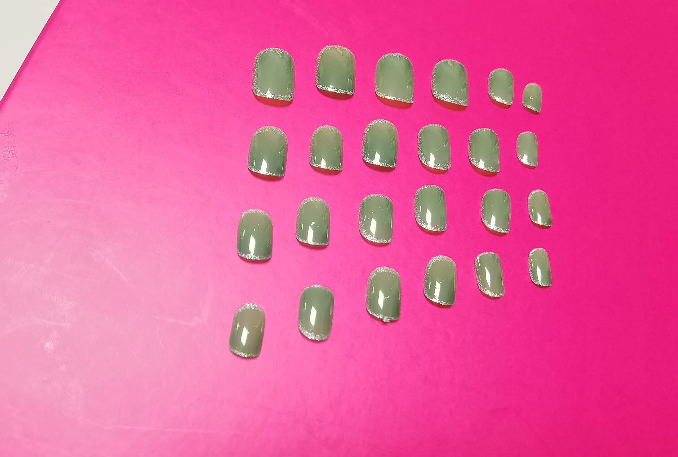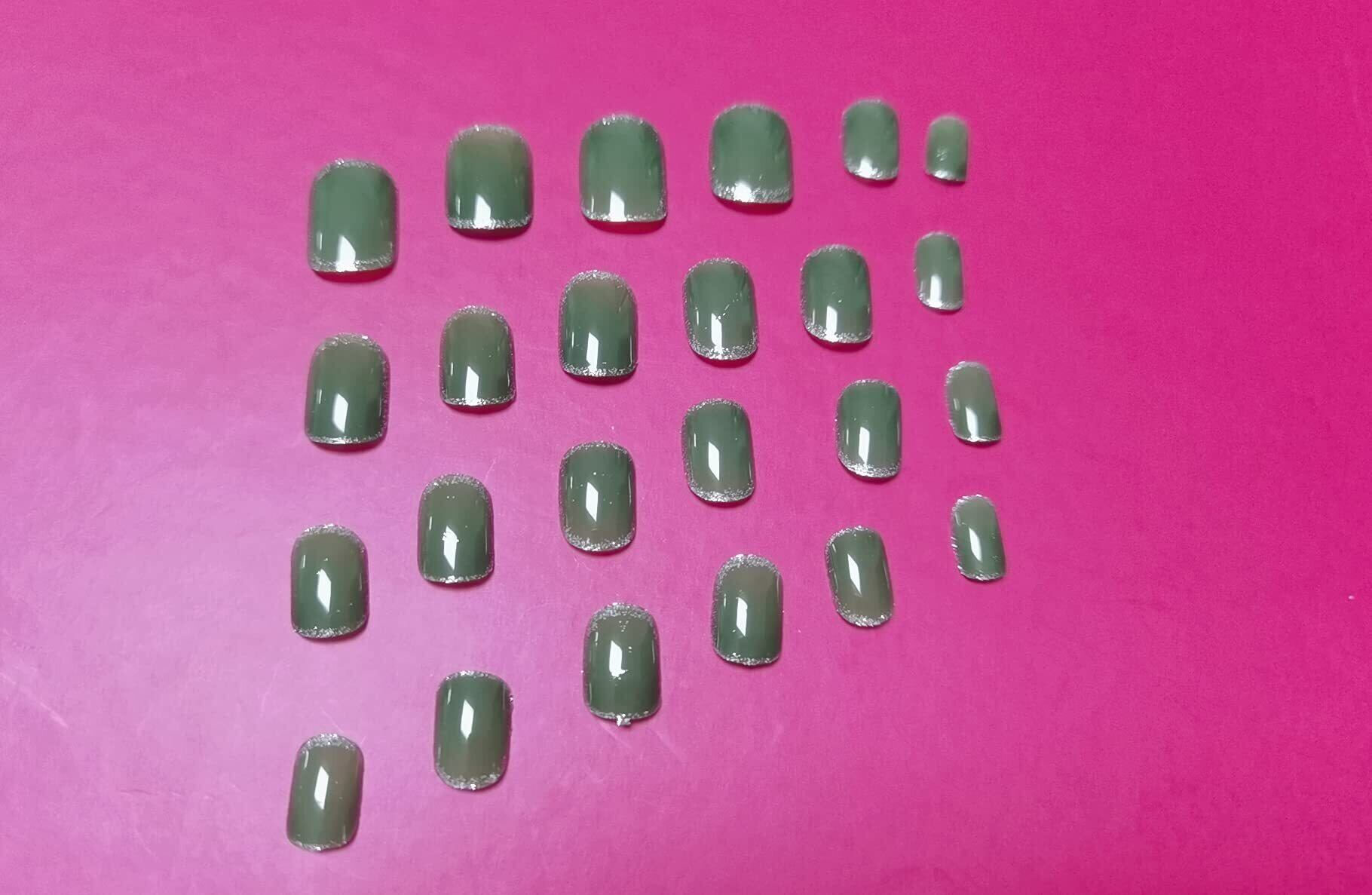 24枚セット ネイルチップ 短い くすみグリーンのキララメネイル
