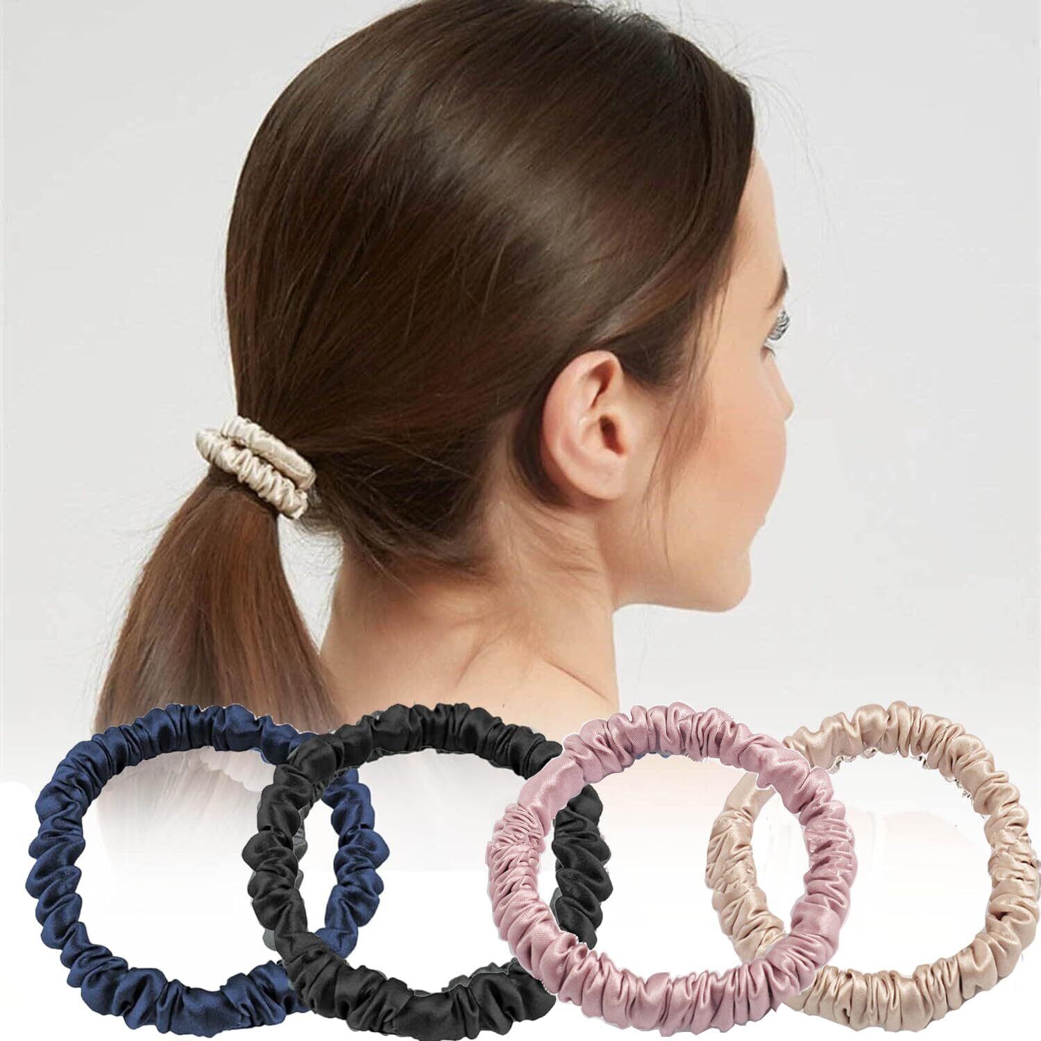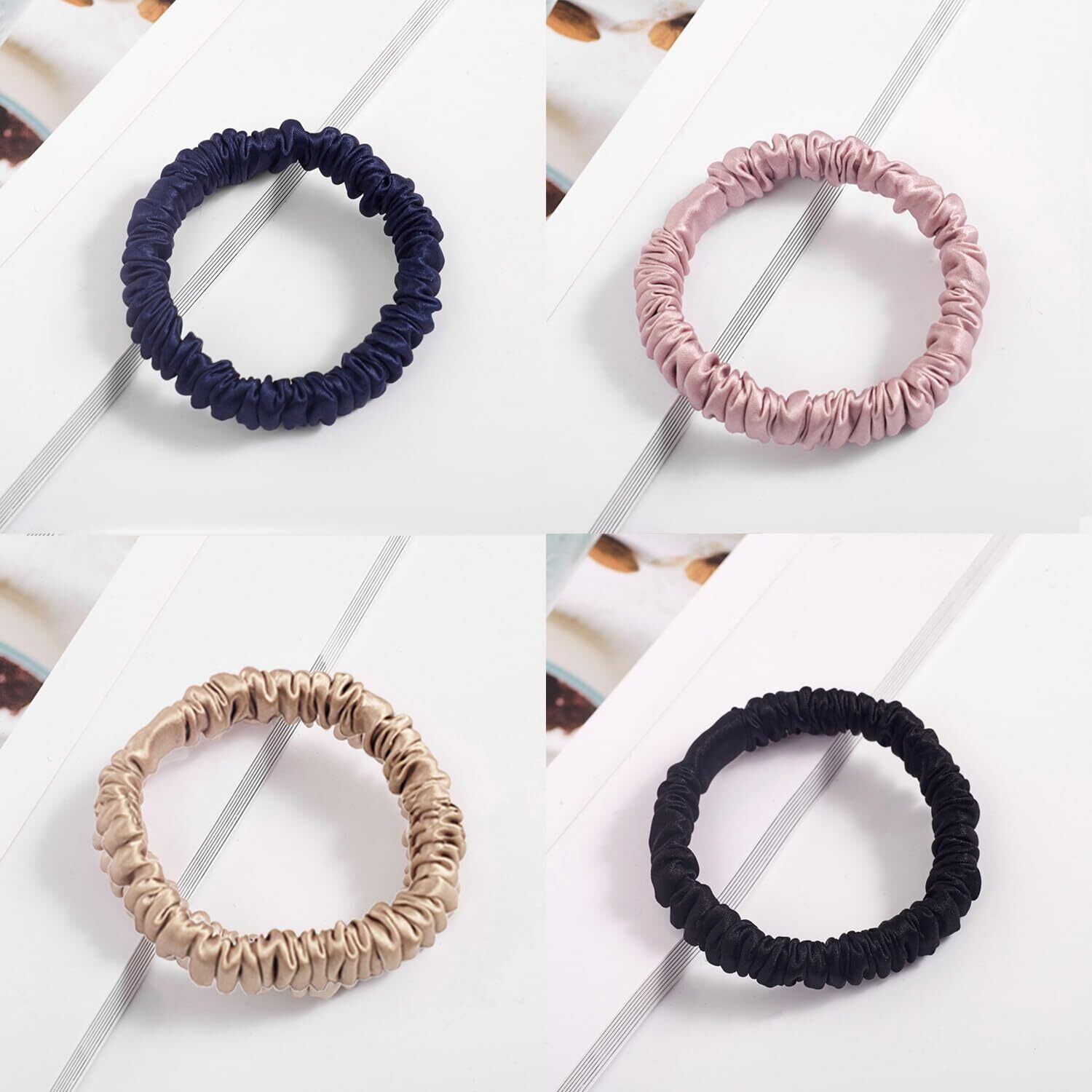 【落ち着いた色】:シルクヘアゴムは4色の組み合わせ:アンズ、ネイビー、ピンク、ブラック。その日の気分や着こなしを色別に選ぶことができ、全体のコーディネートをより落ち着いて上品に見せることができます。