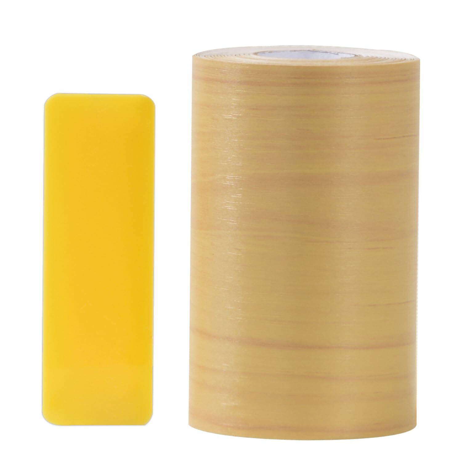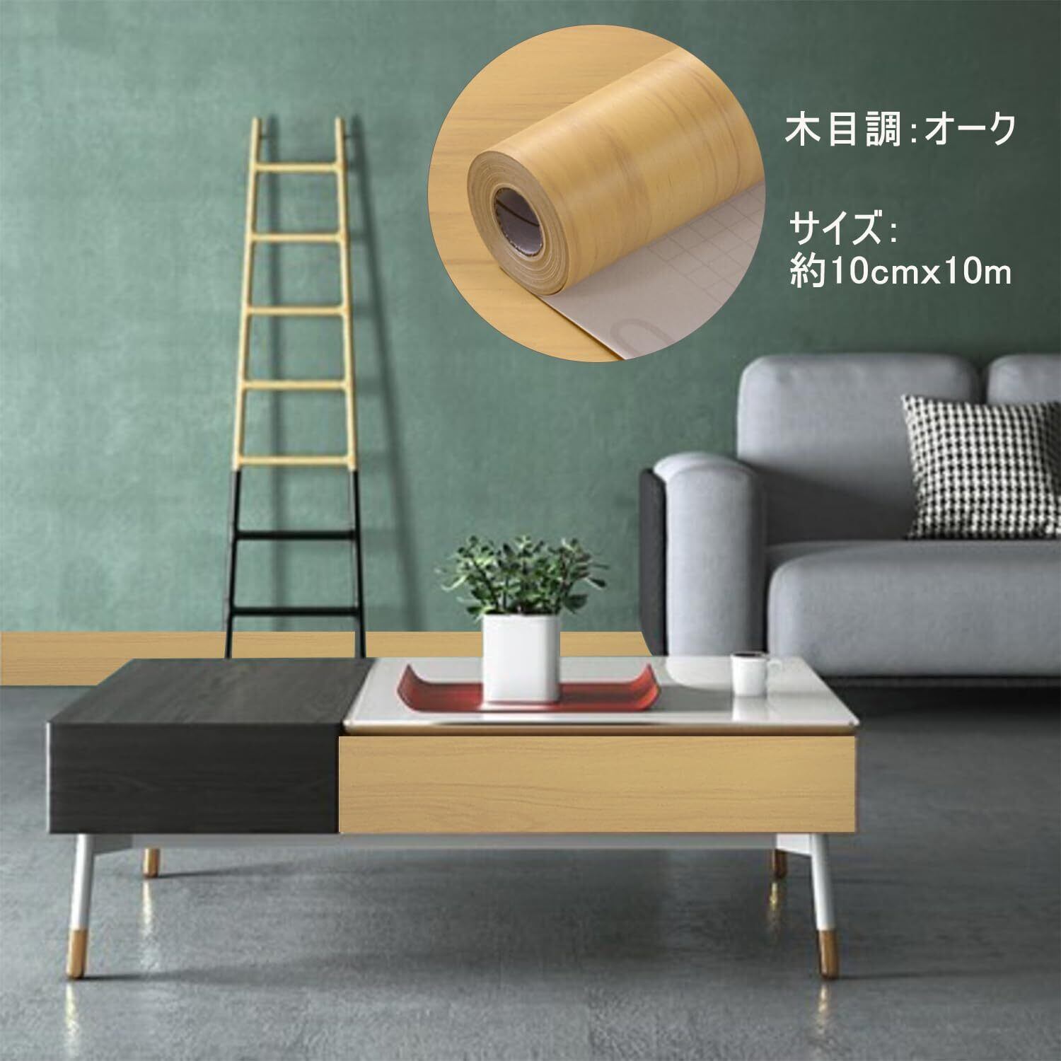 【仕様】サイズ:約10cmx10m 厚さ:約0.25mm 素材:PVC 表面処理方法:エンボス加工 木目調:オーク 内容物:マスキングテープ、おさえヘラ