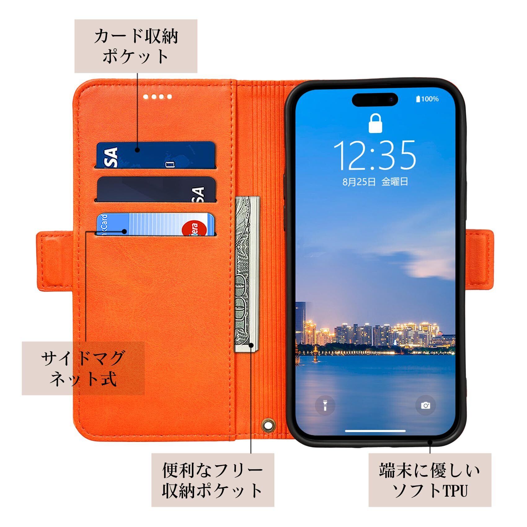 【サイドマグネット式&手首ストラップ付き】このiPhone15ProMaxケースの側面にはサイトマグネットが付けされている、カード面に直接接しないので、磁気カード類が壊れる心配がありません。ケースの下部にストラップホールがあり、カラー別で専用なハンドストラップ一本付き持ち歩きに便利です。