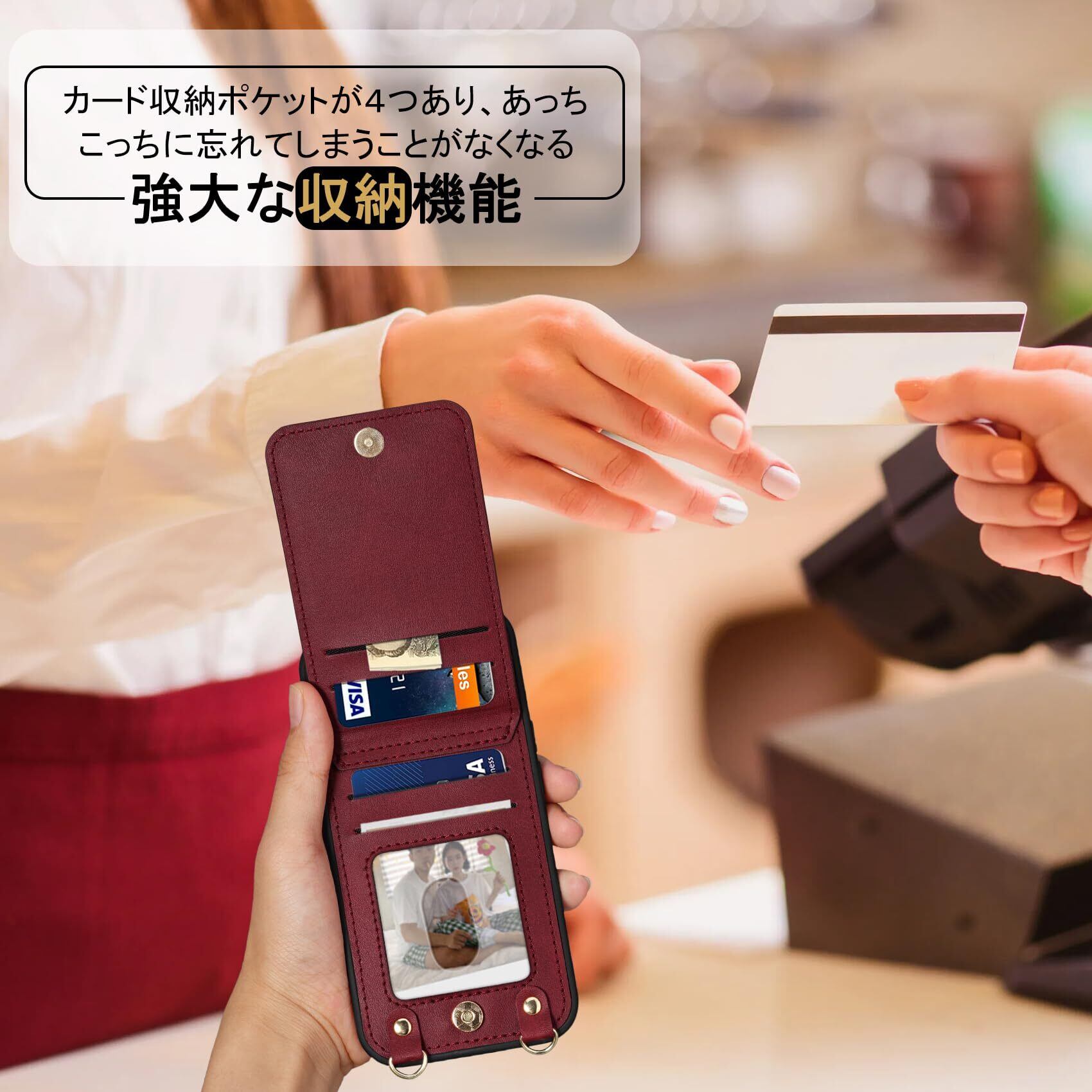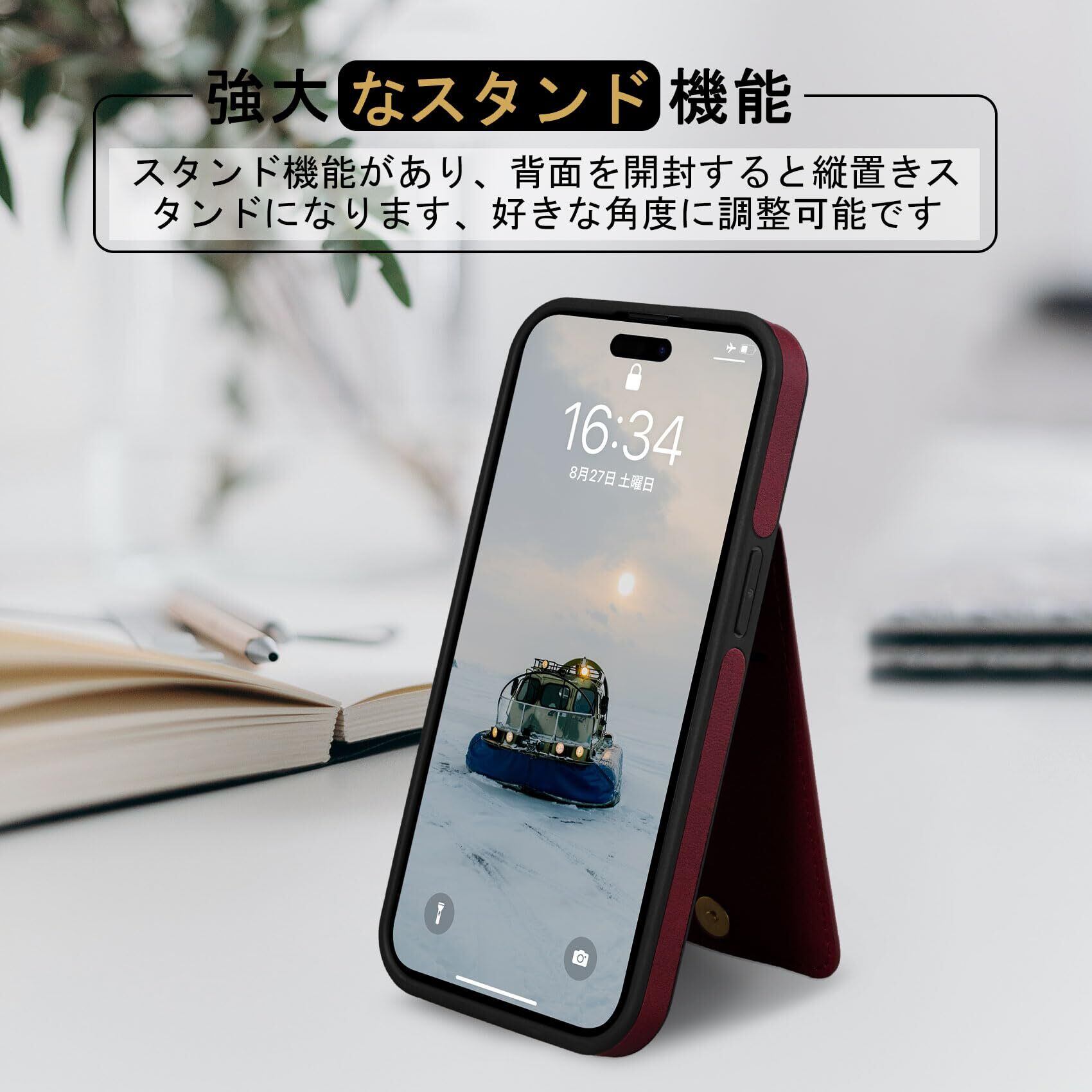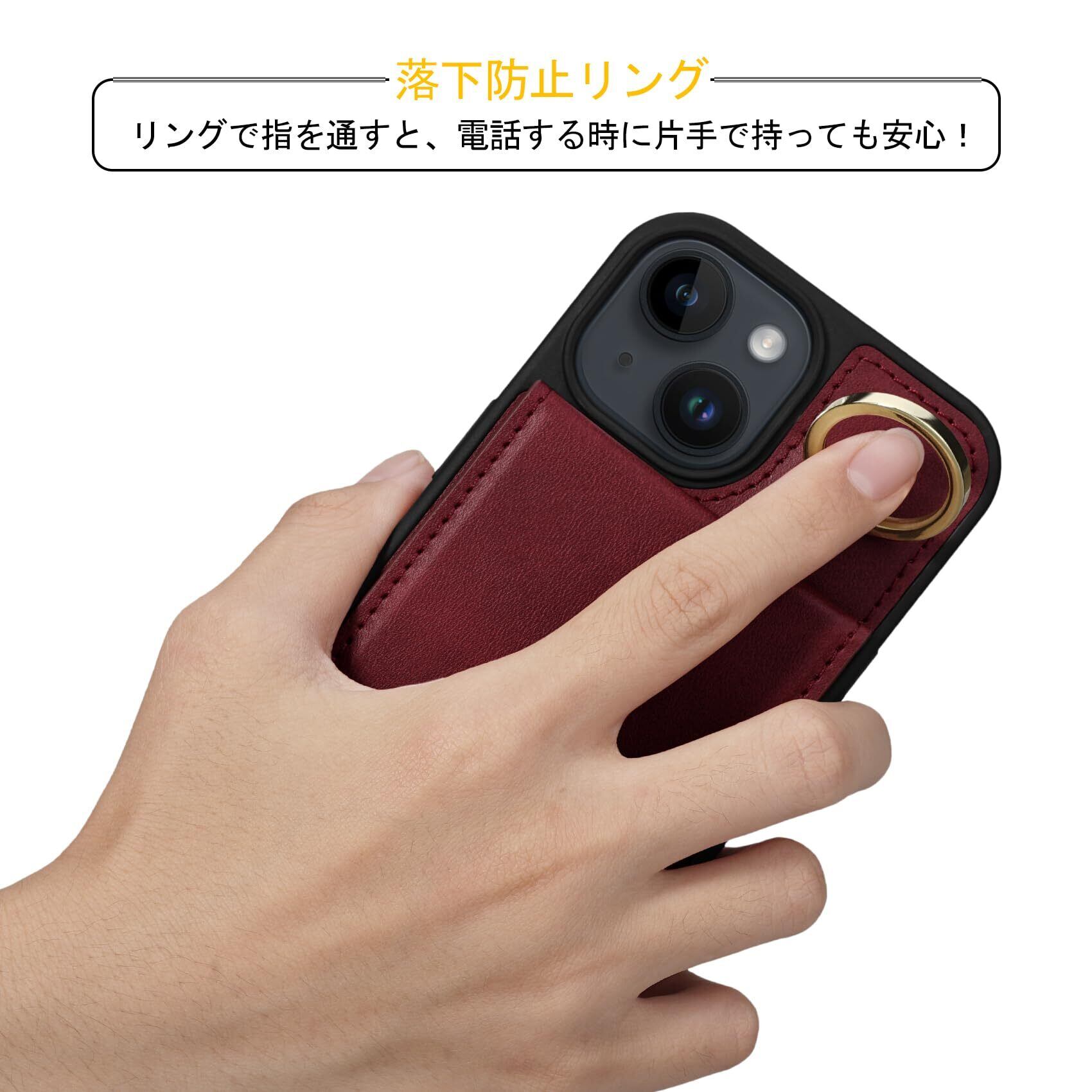 【多機能】❶収納機能:背面には4つのカード収納ポケットがあり、カード、名刺、定期券、免許証、写真などを収納できます。これにより、物を散らかすことなく、必要なアイテムを一括管理し、手軽に持ち運ぶことができます。マグネット式の開閉はしっかりとしており、収納物が落ちる心配もありません。このマグネット式の縦型開閉デザインのiPhone15 用 ケースは、シンプルかつ便利で、コンパクトで美しい仕上がりです。❷スタンド機能:縦置きスタンド機能があり、背面を開けると縦置きできます。お客様はこの機能を利用して、ビデオ通話や動画再生、レシピ閲覧などのハンズフリー操作が可能です。画面の角度を微調整できるため、視聴姿勢に合わせて調節することも可能です。