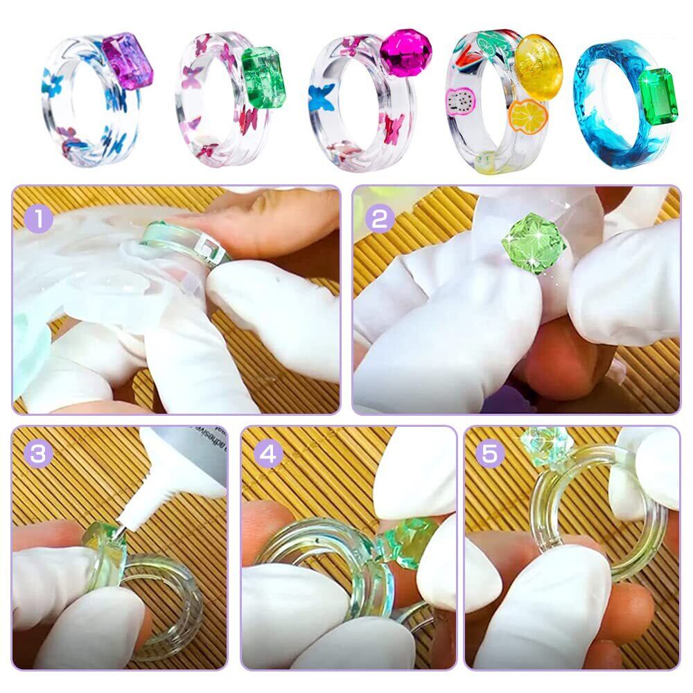 セット内容:指輪シリコンモールド*1、宝石樹脂型*1、ゴム指*10、ストロー*5、攪拌棒*5。
