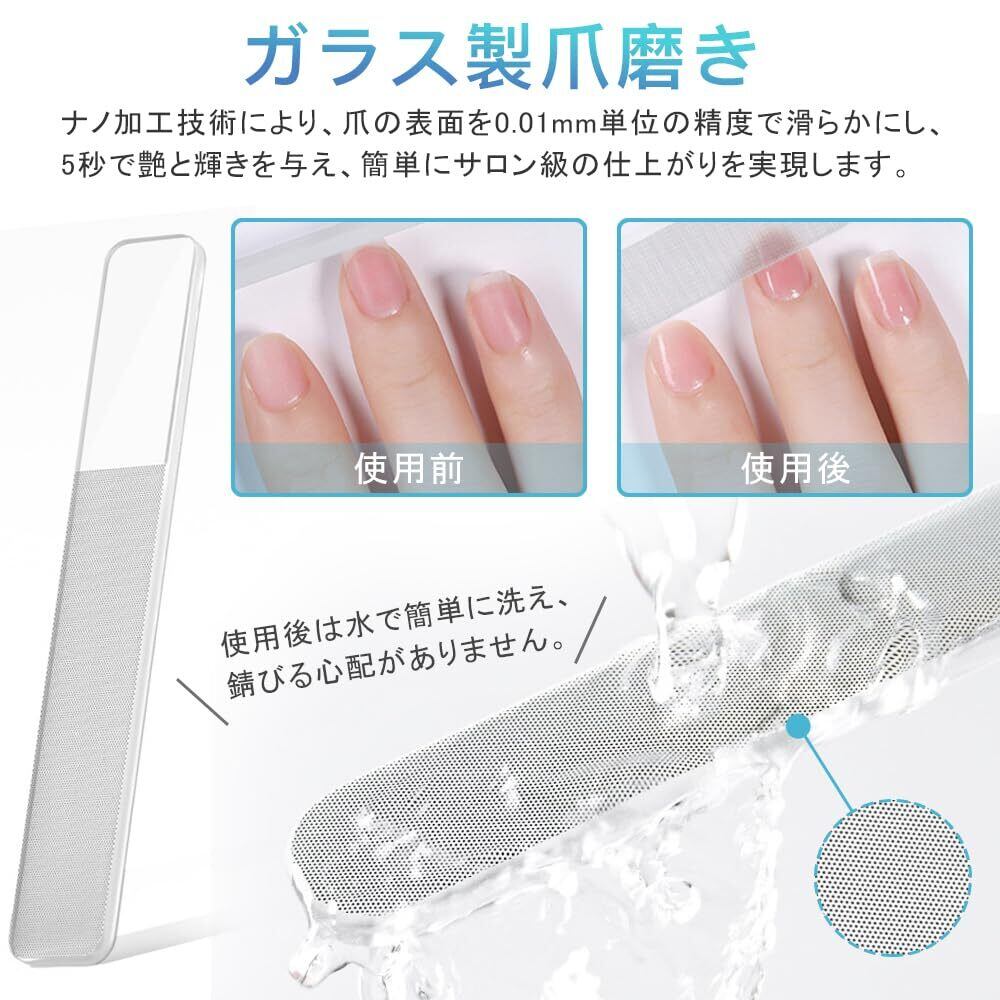 【爪やすり】ガラス素材を使用し、物理的な研磨で健康な爪磨きを実現します。ナノ爪磨きは爪の形を整えるだけでなく、表面や縁の凸凹を滑らかにし、鏡面仕上げの輝きを出せます。