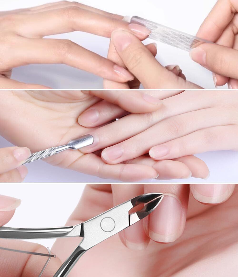 【材質】ステンレス、ガラス 【セット内容】ネイルニッパー*1、ネイルプッシャー*1、爪やすり*1、収納ケース*2。