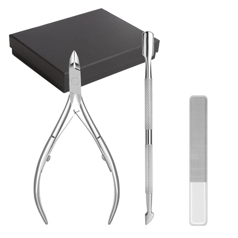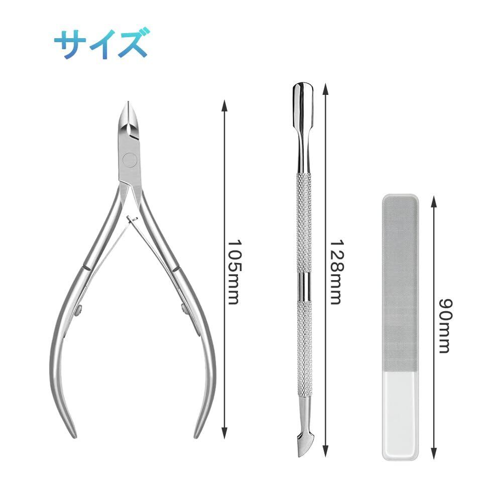 YFFSFDC 甘皮ケアツール 3点セット キューティクルニッパー キューティクルプッシャー 爪やすりガラス製爪磨き ネイル ニッパー プッシャー 爪垢取り 甘皮切り 甘皮処理 ツール (シルバーA)
