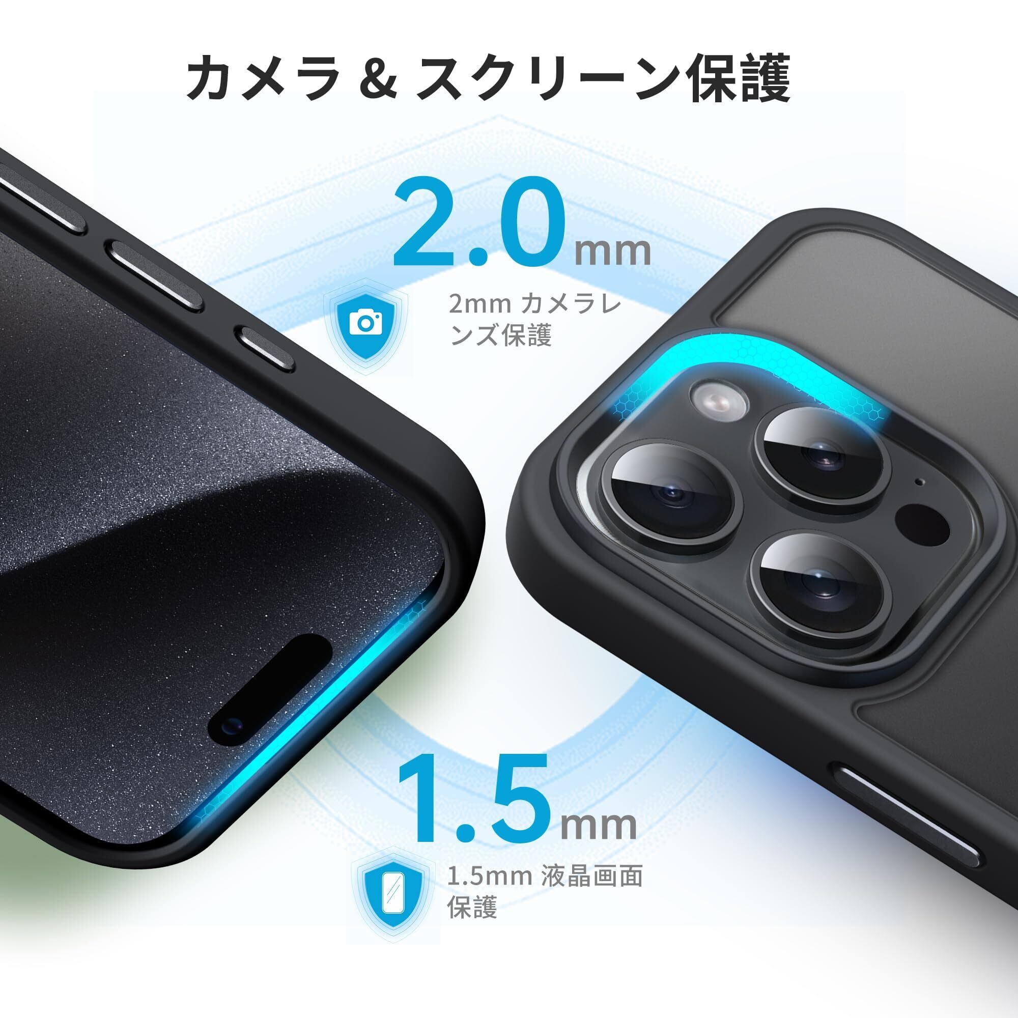Anqrp iPhone 15 Pro 用 ケース 半透明 耐衝撃 滑り止め 米軍MIL規格 指紋防止 マットケース ストラップホール付き ワイヤレス充電対応 スマホケース アイフォン 15 プロ カバー 6.1インチ ブラック