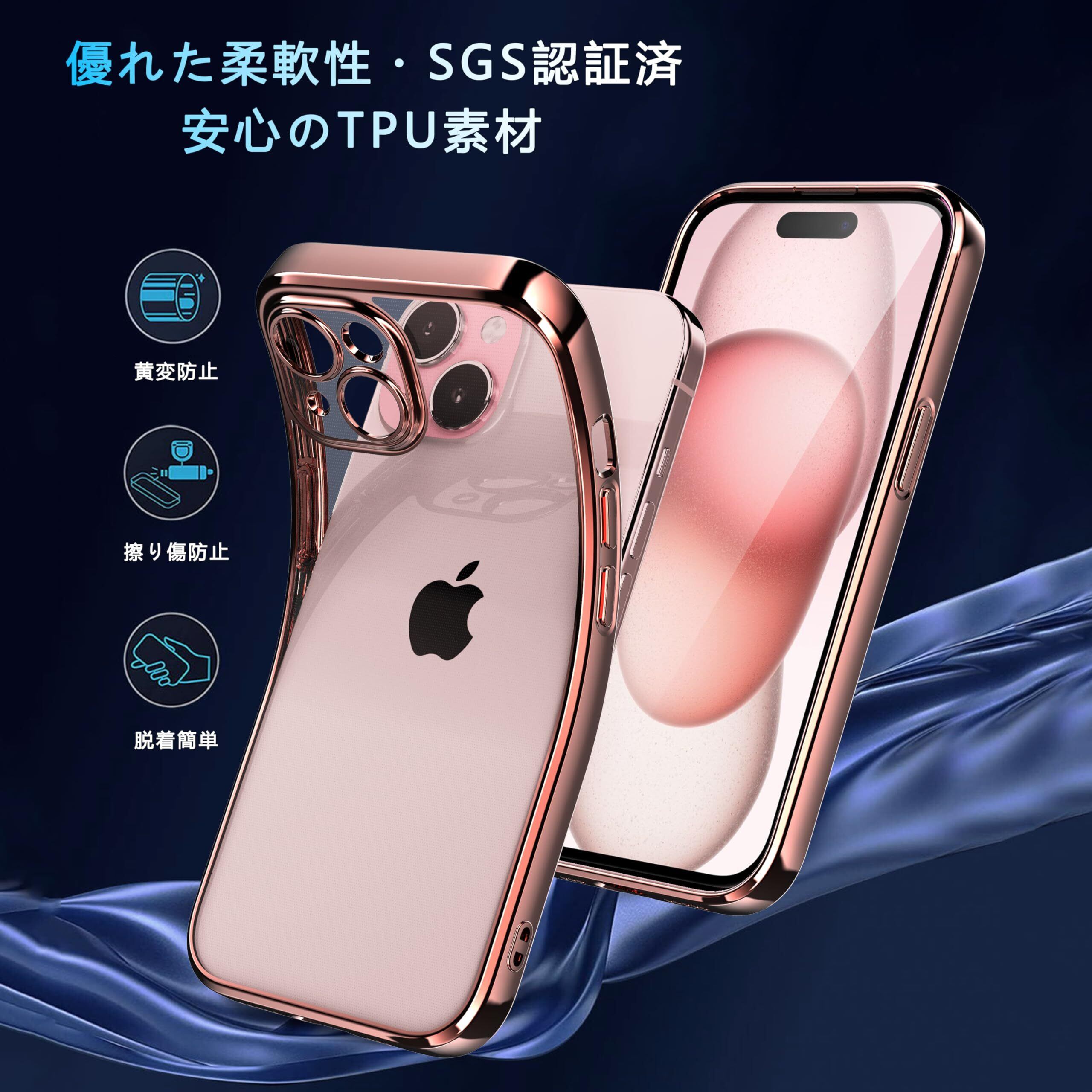 【驚くほどの透明感・メッキ枠加工】iPhone 15 用ケース。ドイツバイエル社産高純度TPU素材を使用し、特殊加工により透き通った高い透明度を実現。また、フレームは4層メッキ加工技術によって設計され、オシャレで独特の輝きを放ち、アイフォン15の美しさを最大限に活かせ、より魅力的にします。