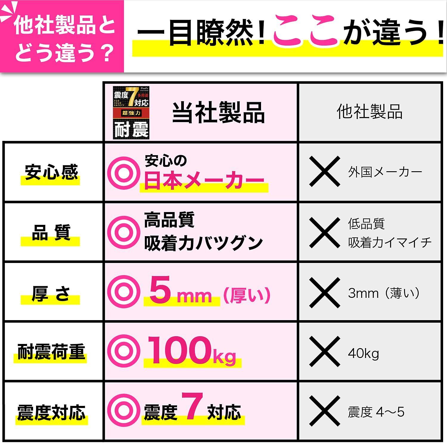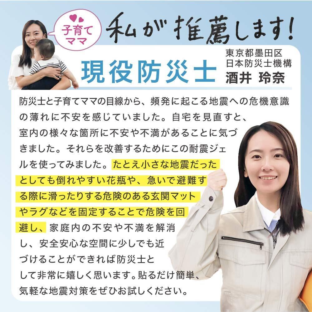 【大地震にも対応】Pearl’s耐震ジェルはの震度7クラスの大地震にも対応。4枚の設置で耐重荷100kg以上(一枚あたり25kg)耐荷重トップレベルです。ご家庭内での不安や不満が解消できるよう何度も検証を繰り返し改良を続け、耐震性、粘着性だけでなく使いやすさも重視した耐震ジェルマットです。開発に携わった防災士も自信を持っておすすめできる商品となっております。