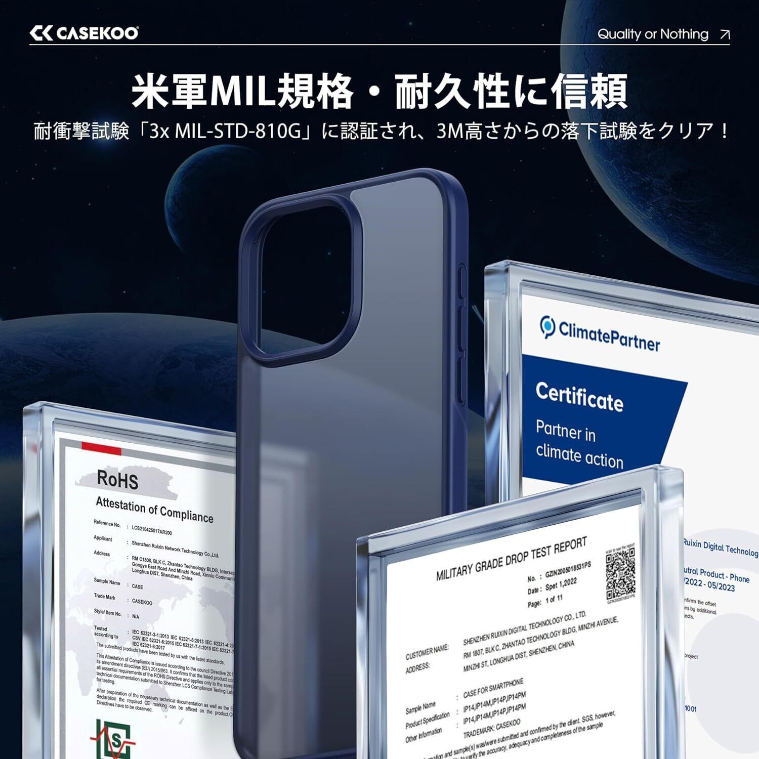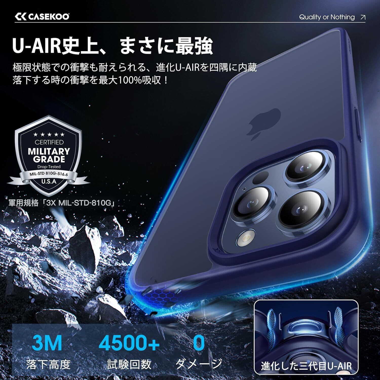 【米軍基準・安心の衝撃対策】米軍MIL規格「MIL-STD-810G」をパスする強靭な保護iPhone15Pro ケース。それ以上、ポケットから取り出す時にうっかり落ちたり、歩きスマホ中にうっかり人とぶつかって落としたなど、よくあるスマホを落とす状況の試験も行った。無傷で済む!