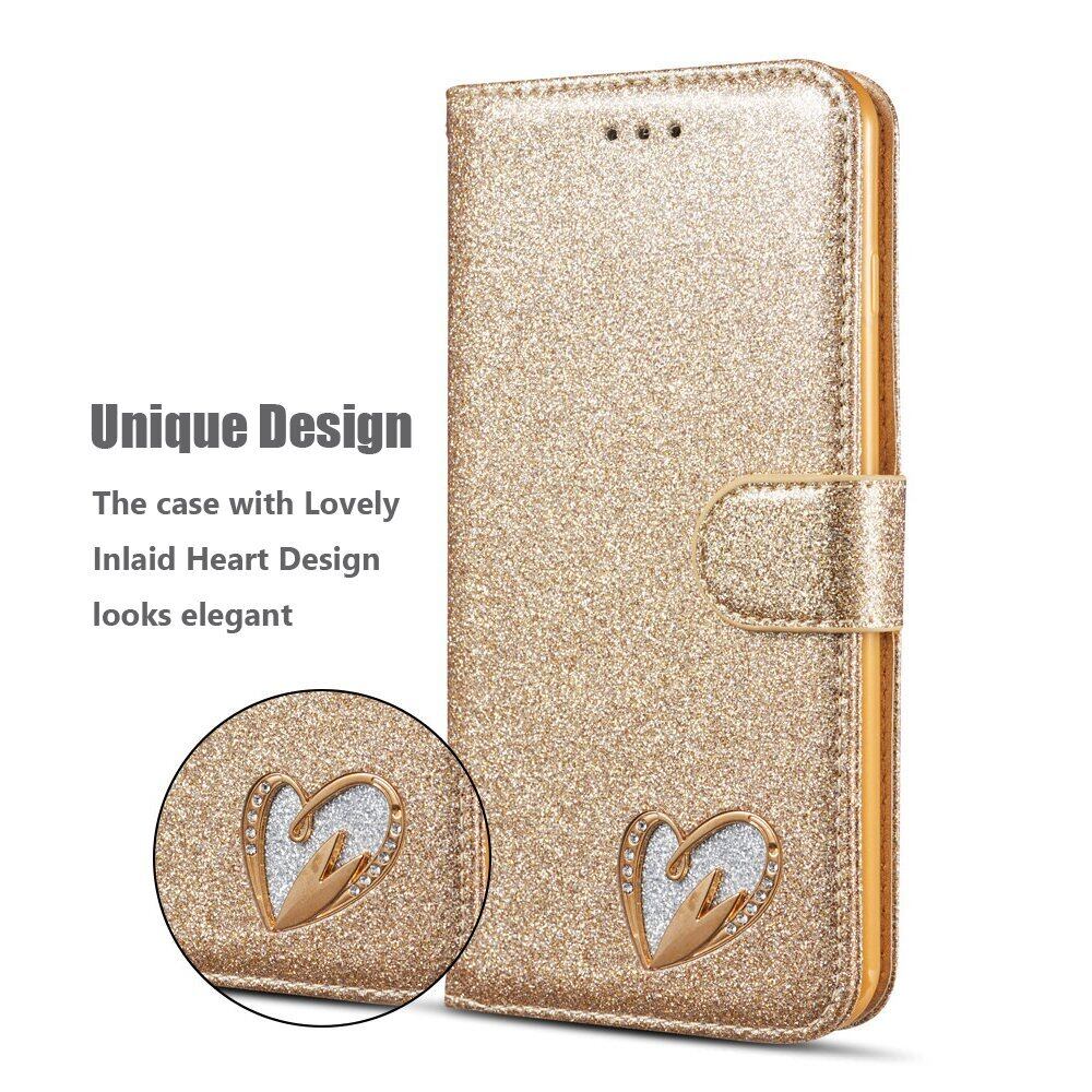 【スタイリッシュなデザイン】キラキラのPUレザーで作られて、ハート形のラインストーンを綺麗に象嵌しています。おしゃれでかわいくて、自用にもギフトとしても素敵です。上質な人気スマホケースです。