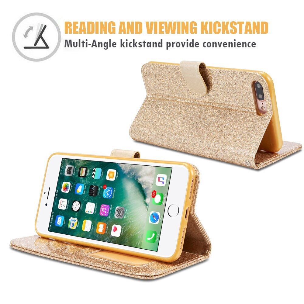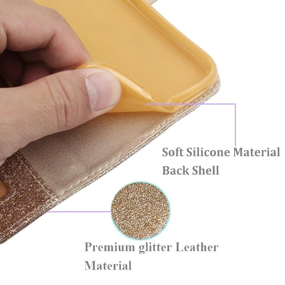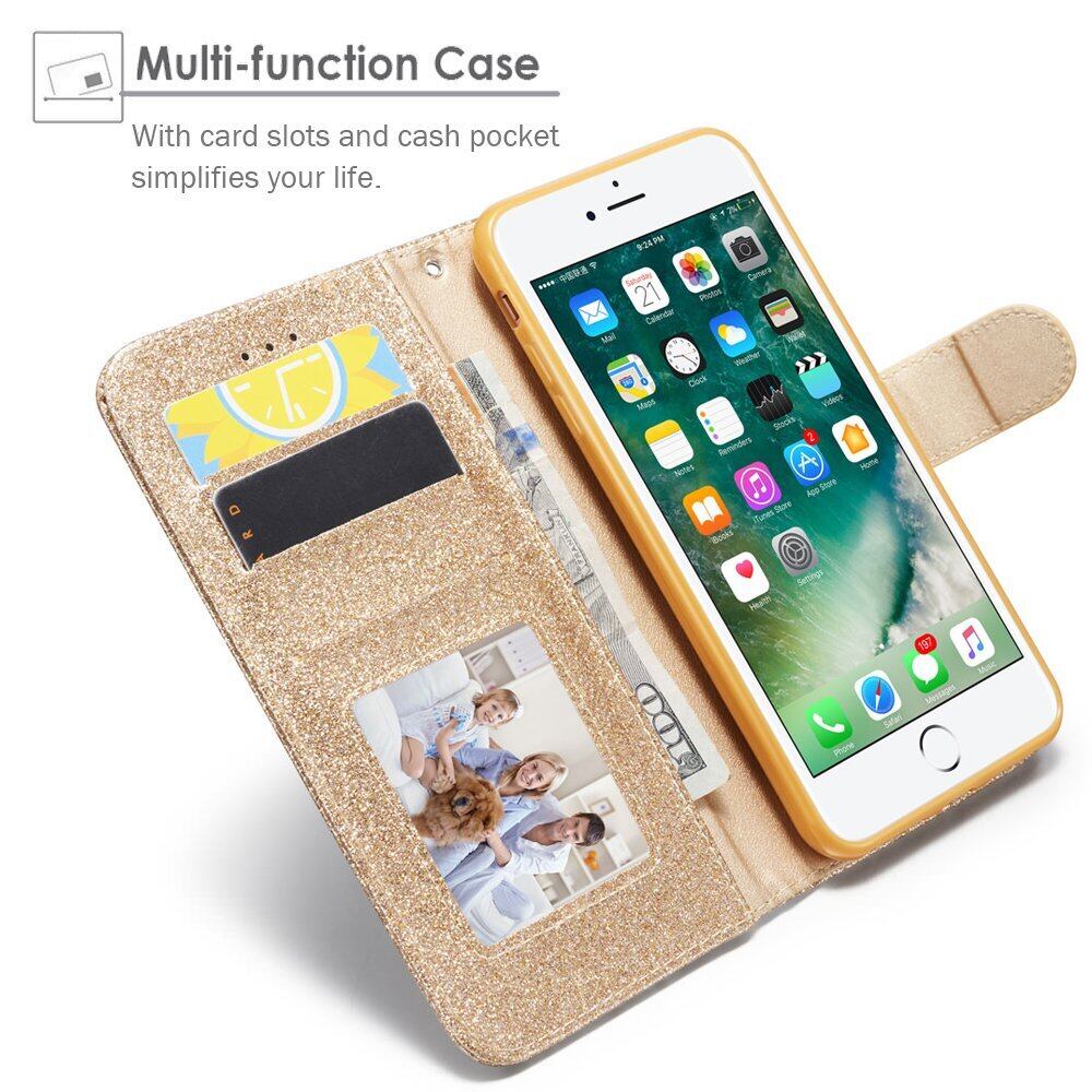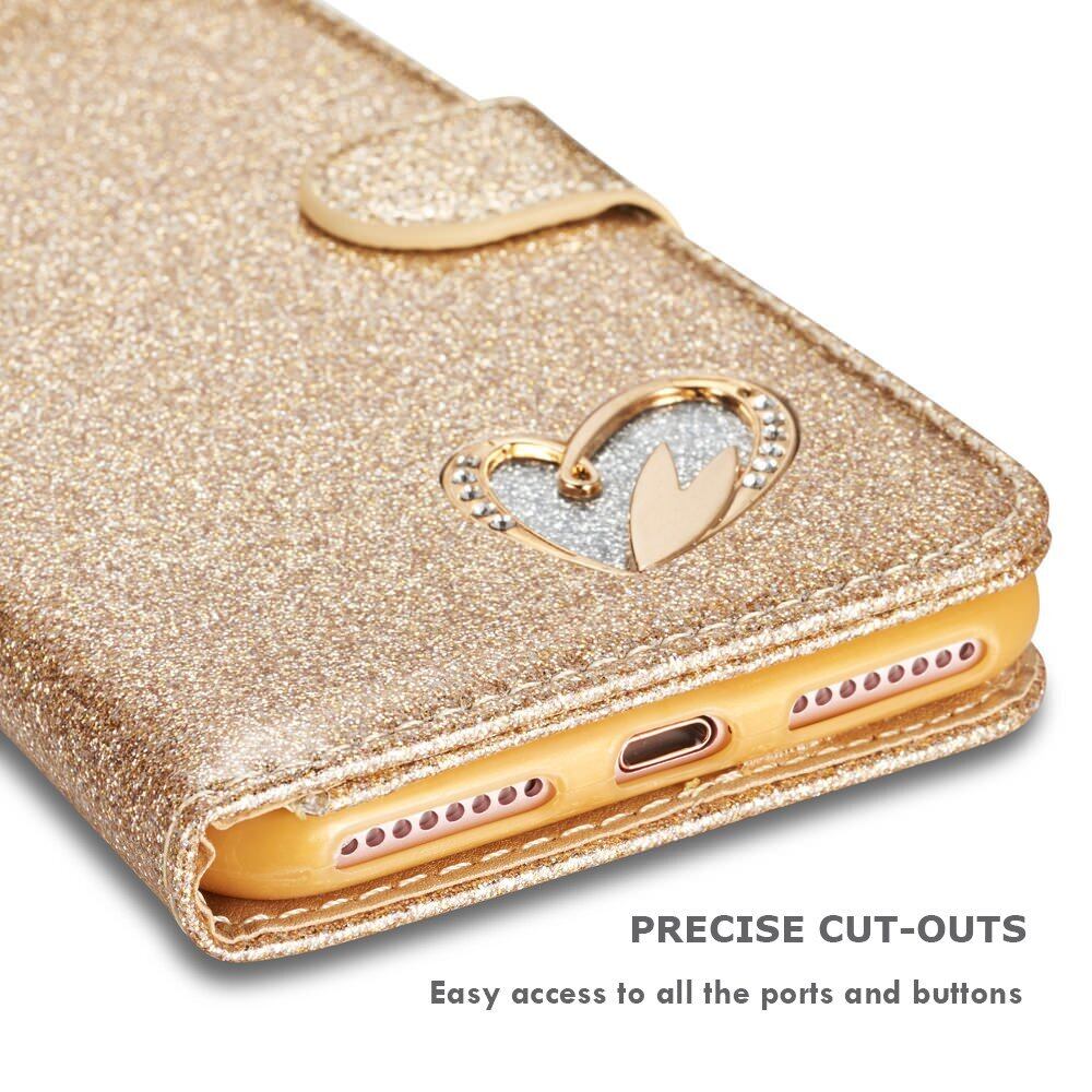 QLTYPRI iPhone SE ケース 第3世代 2022 5G/iPhone SE ケース 第2世代 iPhone7用ケース iPhone8用 ケース 手帳型 PU カード収納 マグネット式 スタンド機能 全面保護 スマホケース かわいい おしゃれ ストラップ付きアイフォン7/8/SE2/SE3用カバー - ゴールド
