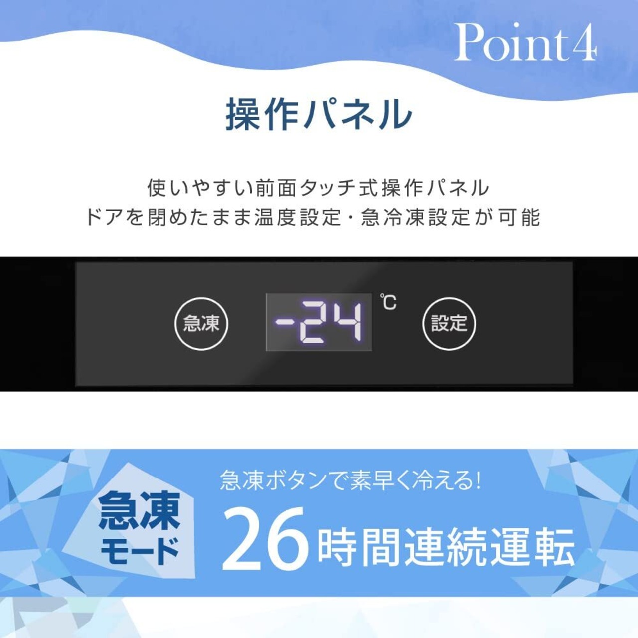 使いやすい前面タッチ式操作パネル。 ドアを閉めたまま温度設定・急冷凍設定が可能。急凍ボタンで素早く冷える!26時間連続運転。