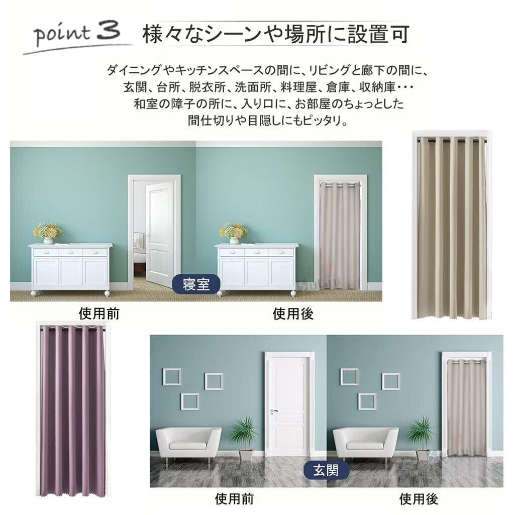 【遮光・省エネ】:リビング階段などの冷気、暖気の遮断にも最適で簡単に目隠しや間仕切りになる間仕切りカーテン。キッチンなど水や油などの汚れが気になる場所でも、定期的にお洗濯することで清潔感なのれんを保って頂けます。