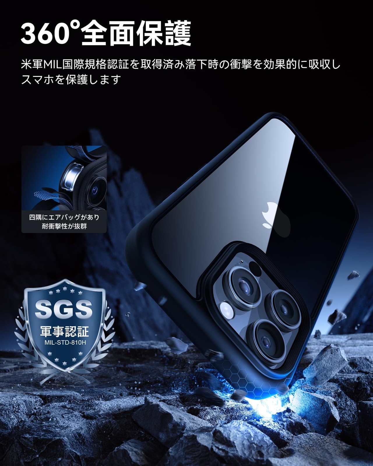 【米軍規格SGS認証・超強耐衝撃性】世界で有名な米国防総省が規定する米軍採用品規格「MIL-STD-810H」認証を取得済みです(認証番号:GZMR220802496801)。コンクリートの地面に厚さ5mmの合板を敷き、高さ1.2mから合計26回、違う角度から落下させる実験をしましたが、本体に傷はつきませんでした。四隅には高耐震クッションを搭載しており、高い耐衝撃性です。スマホを全方位からしっかりと守ります。