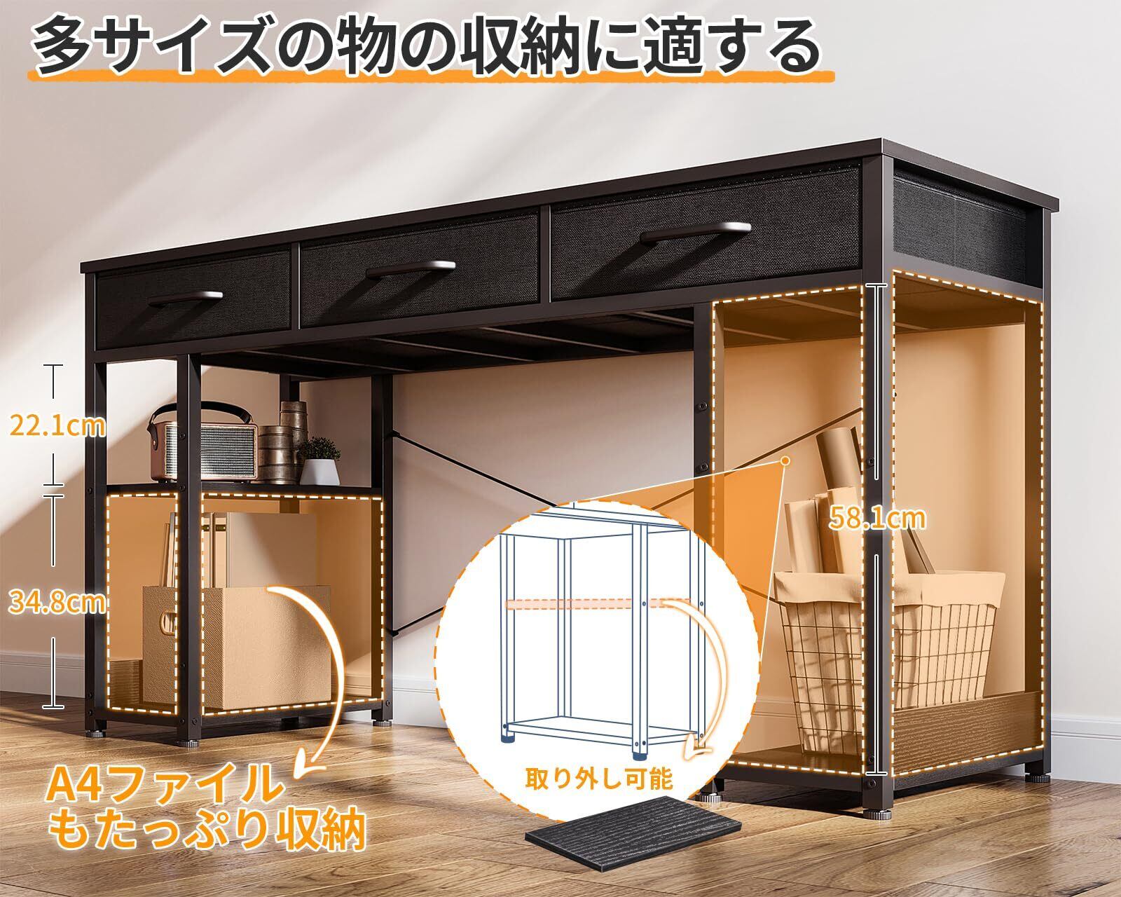 【引き出し3杯付き、手の届く便利さ】A4対応の引き出しは、不織布+MDFボードの材質で、重いものを入れても変形しにくい。収納袋の下に補強パイプが6本備わっており、しっかりサポートできる。プライバシーをよりよく保護し、ほこりが落ちるのを防ぐ。