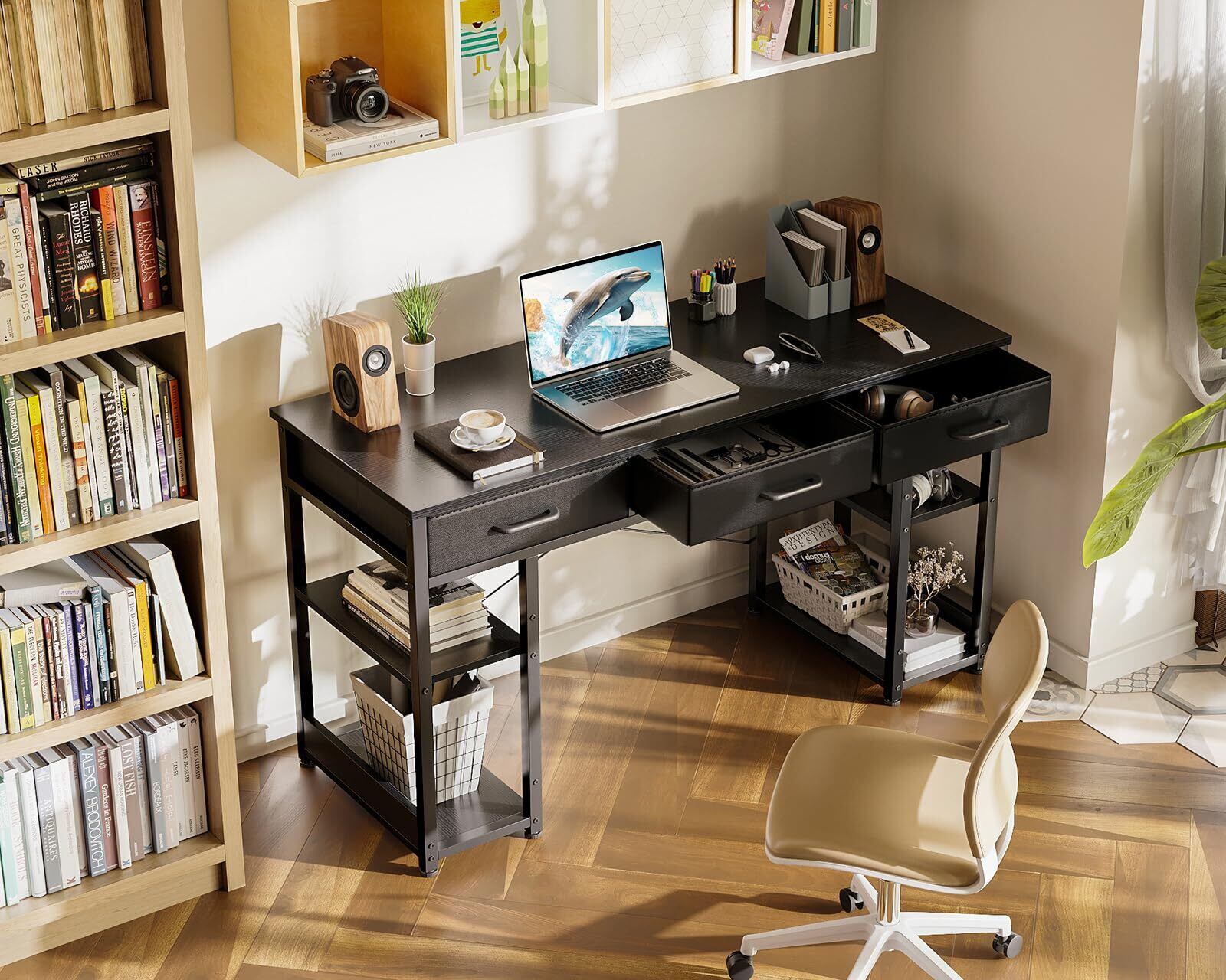 【限られたスペースでも究極な収納を実現】多様な収納設計で、さまざまなサイズの物の収納に適している。特に大きいなスペースを取らないのに、収納を増やしながら、机をスッキリ片付ける。作業と収納のエリアを明確に区切るし、足下の空間も十分(幅77.4×高さ63.5cm)だし、効率的で快適に働く。