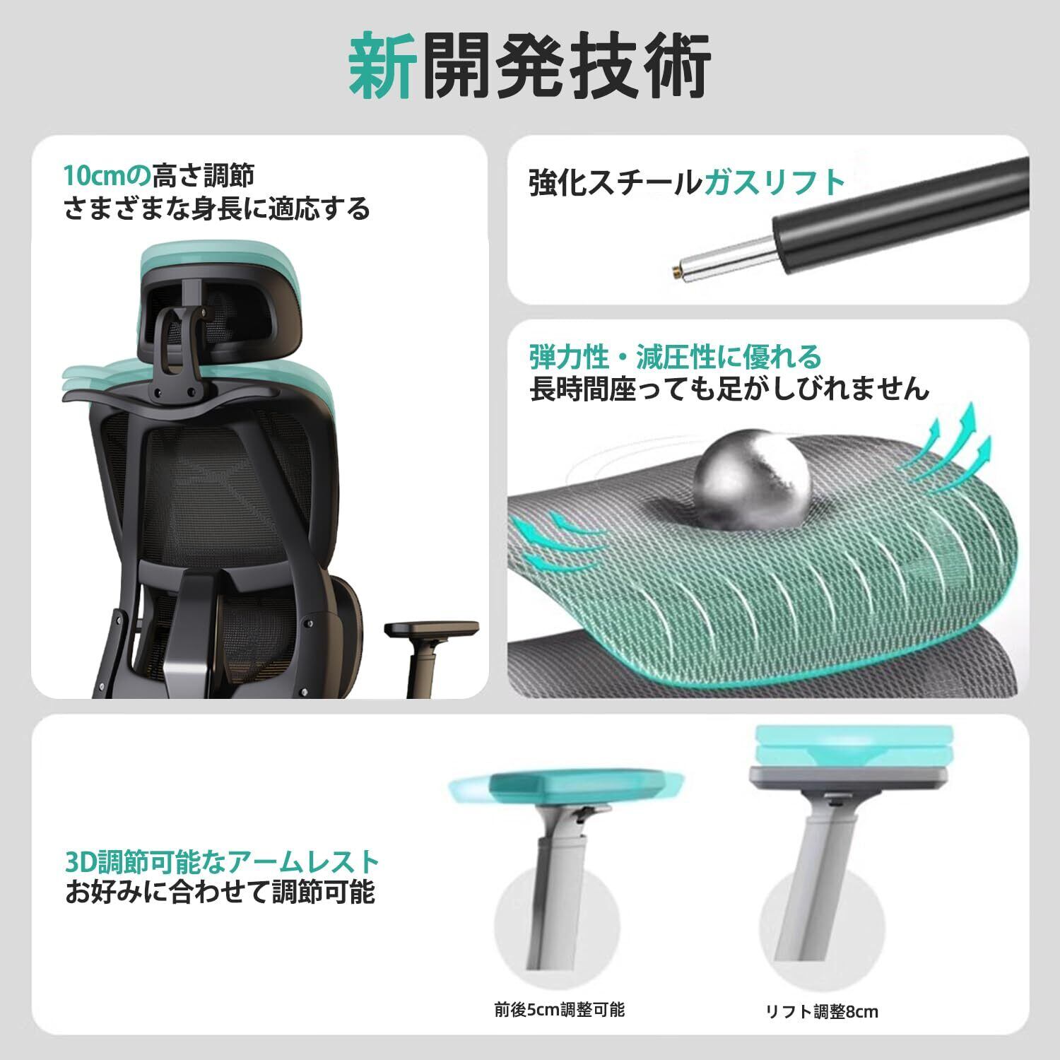 【多機能・高級感椅子】本椅子は上から3Dヘッドレスト装備して余分な頚支持問題を完璧に解決します。全身特製メッシュ素材で落ちる問題と通気性の問題を解決します。さらに一体化のオットマンと145度リクライニング機能は十分な休憩体験を満たします。5cmの座り奥行調整と10cmの高さ上下調節できて、ほとんどの人の身長に対応できます。