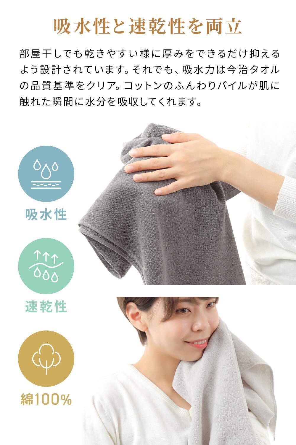 【吸水性と速乾性を両立】部屋干しでも乾きやすい様に厚みをできるだけ抑えるよう設計されています。それでも、吸水力は今治タオルの品質基準をクリア。コットンのふんわりパイルが肌に触れた瞬間に水分を吸収してくれます。