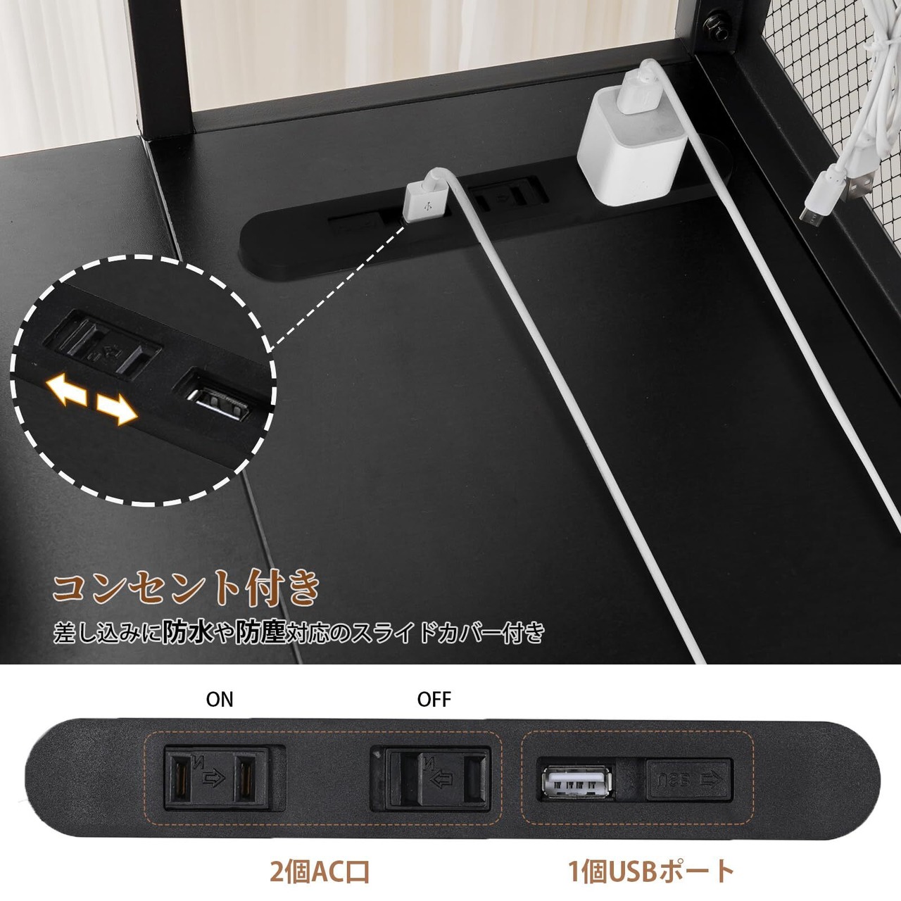 【コンセント・USBポート付きで充電楽々】パソコンデスクのコーナーにマルチ電源タップが設置されております。この電源タップは2個AC口と1個USBポートがあります。スマホを充電したり、パソコンを電源に繋がりながら作業ができてとっても便利です。差込口の表面にはホコリ防止シャッター付きで安全に取り付けることができます。