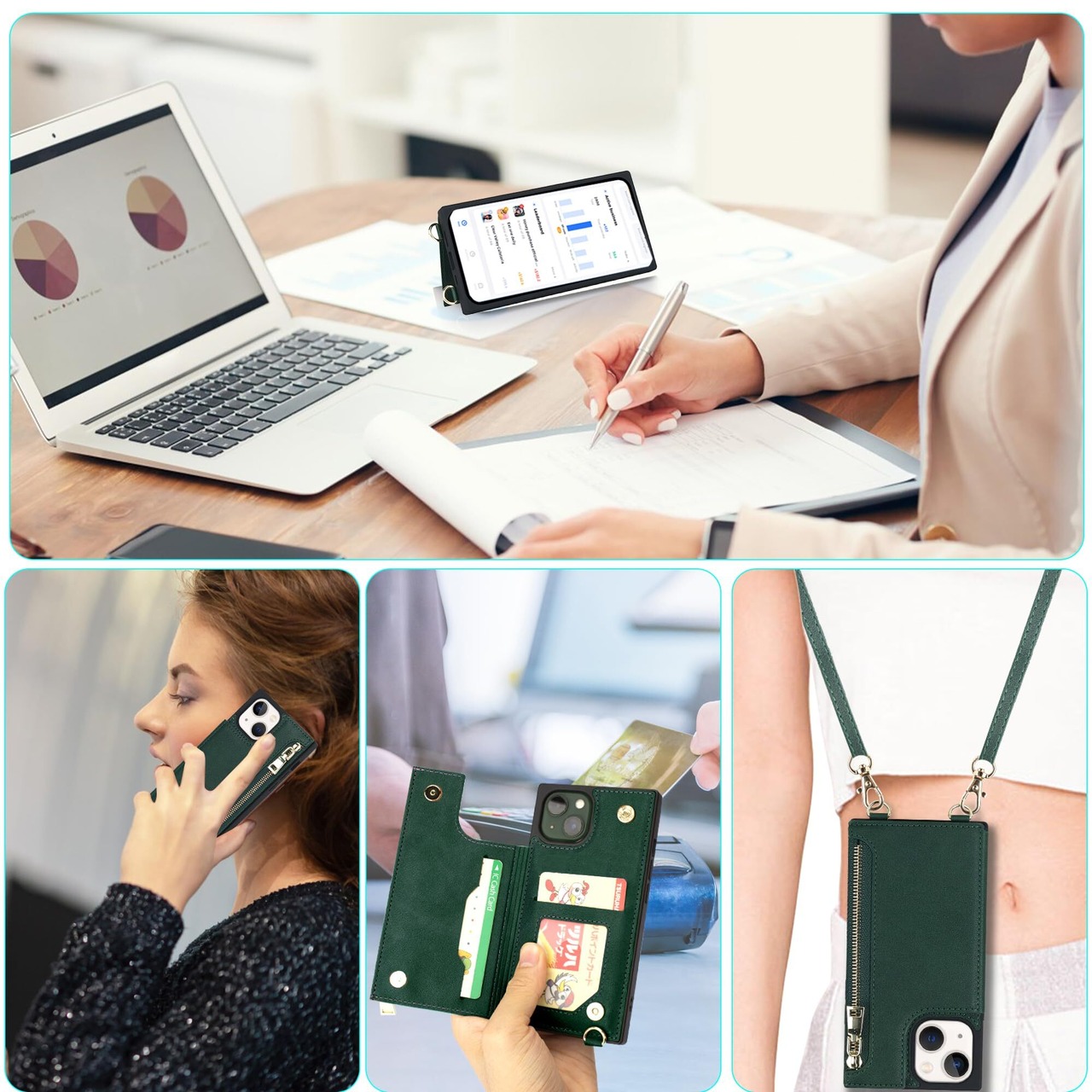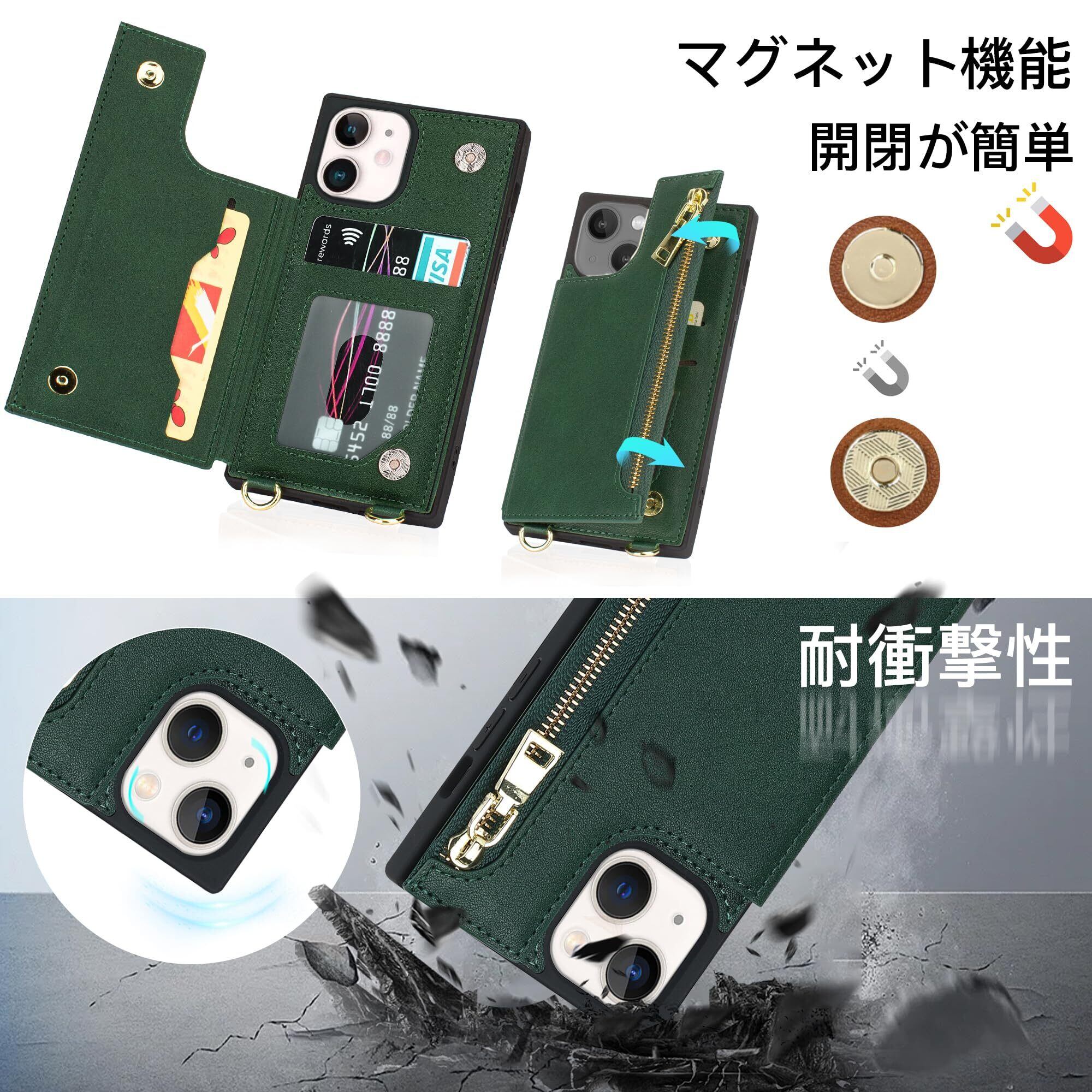 NODALA iPhone 13 mini ケース 手帳型 背面収納 ショルダー あいふぉん13 みに カバー アイフォ13ミニ ケース 財布型 いphone 13 mini スマホケース 肩掛け 斜めがけ 首かけ ストラップ付き 長さ調整可能 携帯ケース おしゃれ カード収納 左右開 耐衝撃 ステント機能 グリーン
