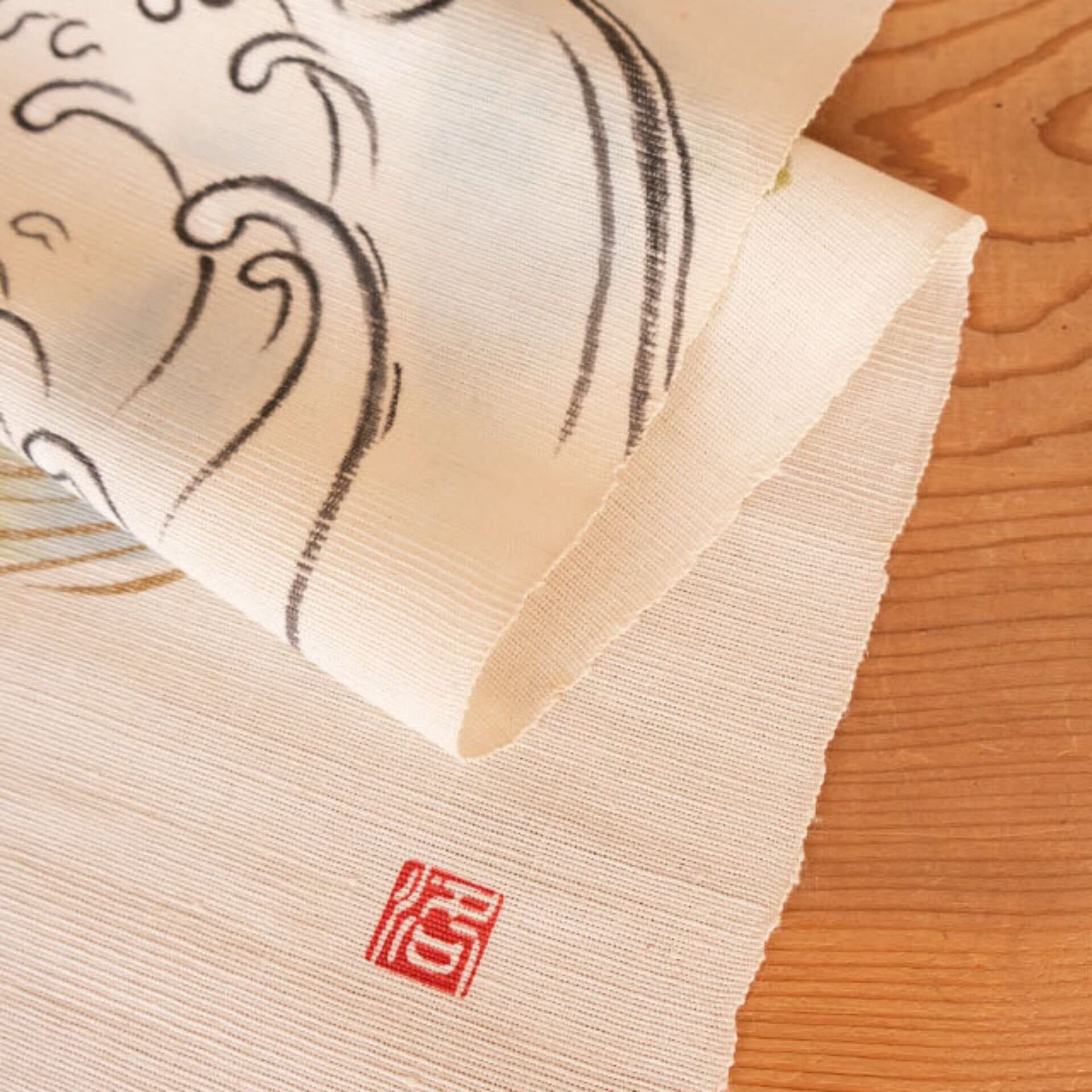 モチーフ:【つるかめ吉祥】和モダンインテリアを演出する手染め麻タペストリー。長寿で知られる鶴と亀の縁起の良い柄を、色鮮やかに染め上げました。延年転寿を願い、新しい年の始まりを祝います。