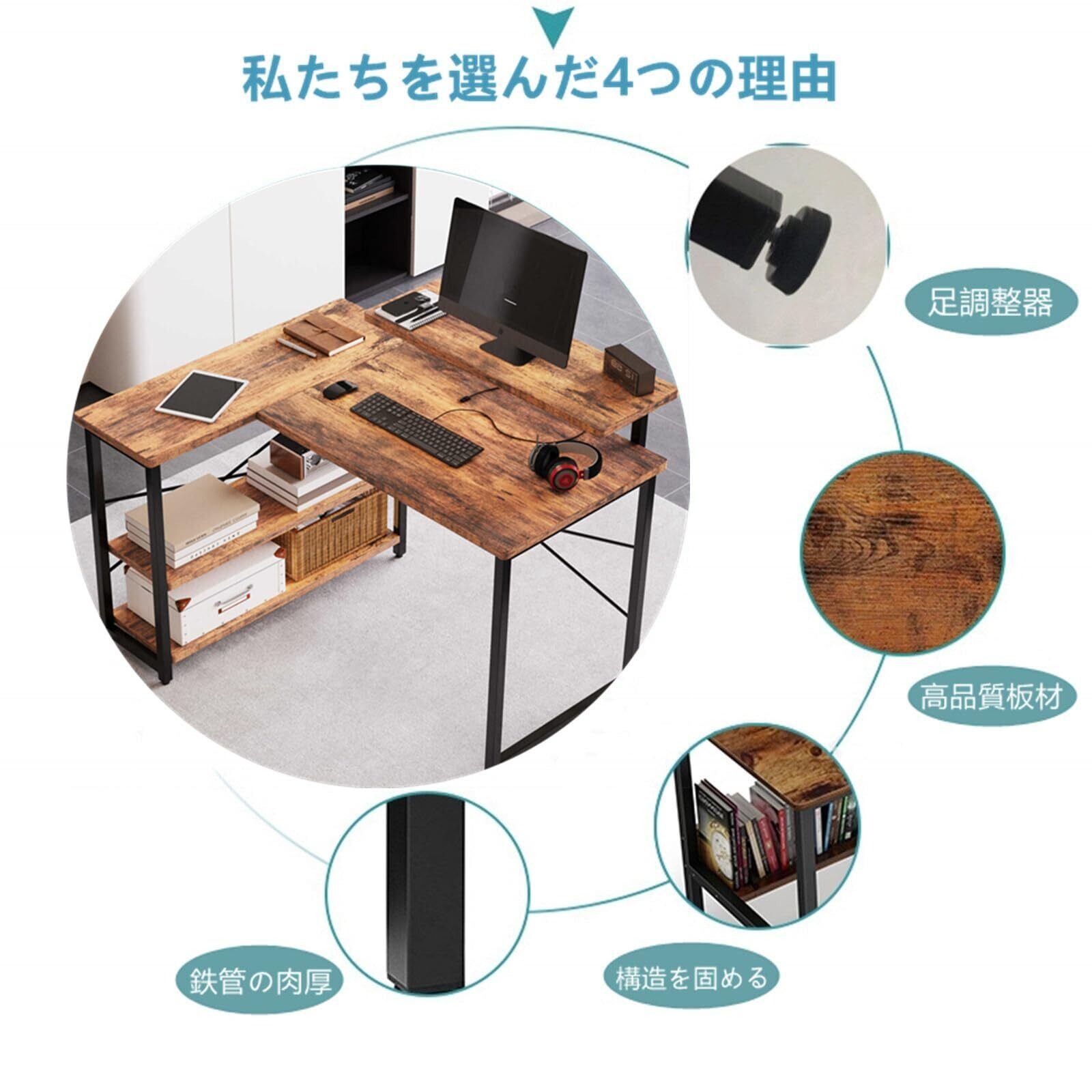 Embrace life パソコンデスク computer desk 机 収納 ゲーミングデスク L字型 リムーバブルラック pcデスク デスク ラック付き コーナーデスク オフィスデスク 在宅勤務 副105cm トラ皮色