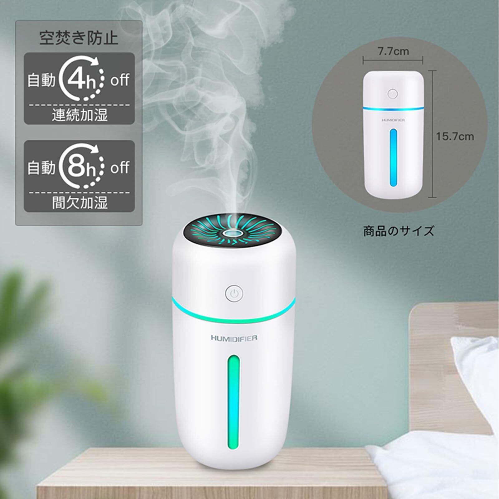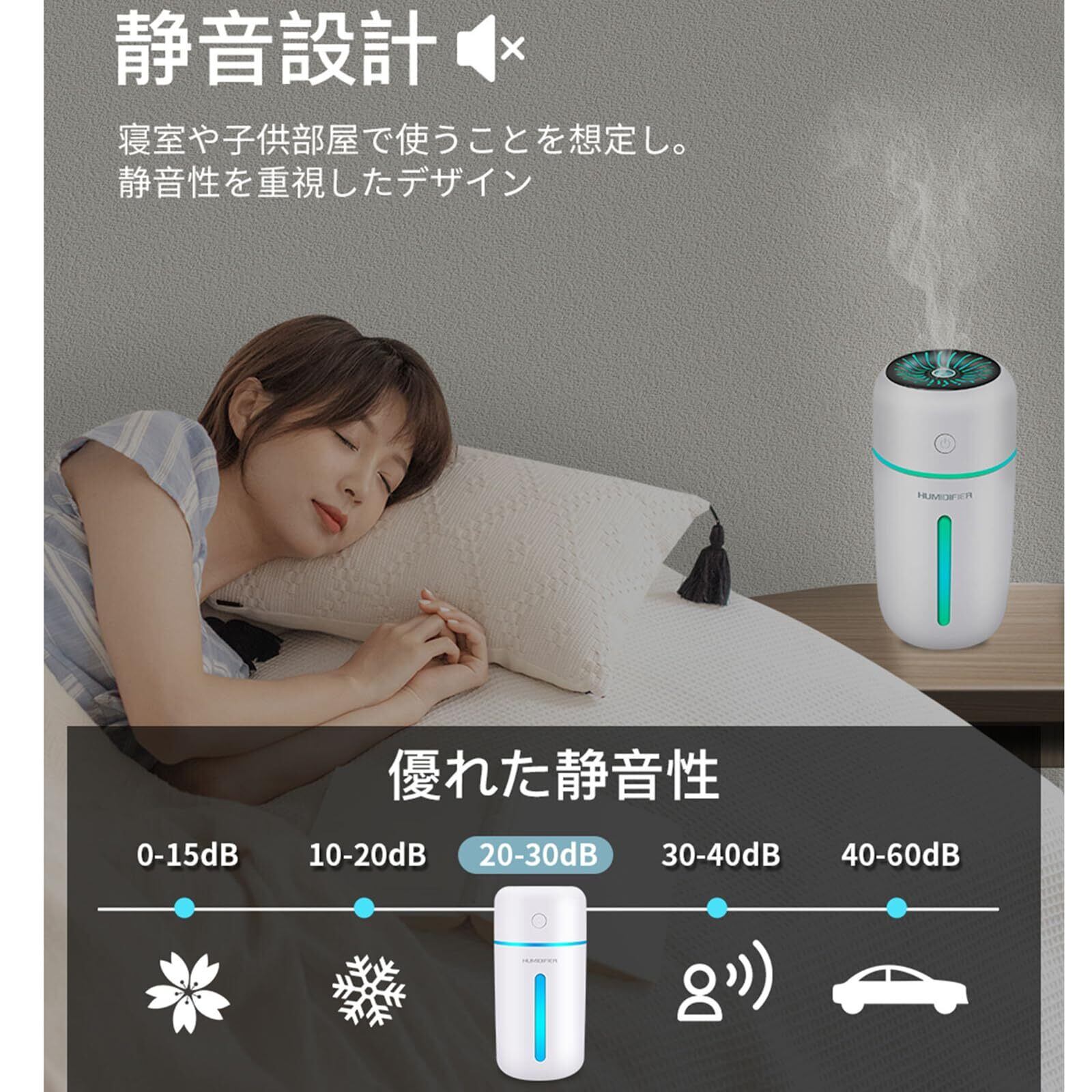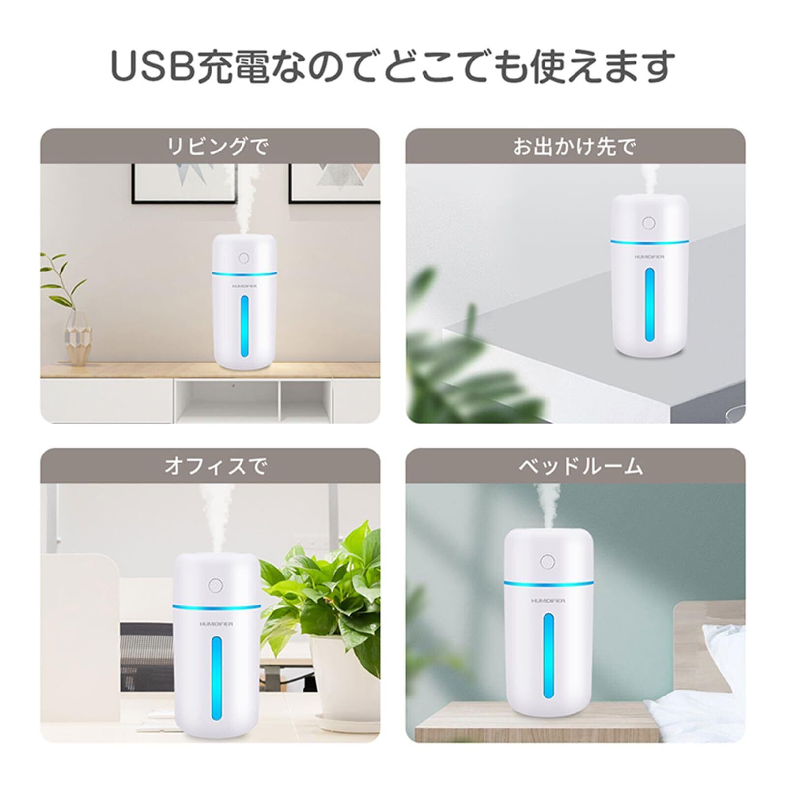 【いつでもどこでも使えるポータブル設計】USB充電式で、350mlの大容量タンクを備えたポータブル加湿器。軽量かつコンパクトで、オフィスや自宅、車内、旅行先など、さまざまな場所で使用できます。コードレスで、持ち運びやすく、どこにいても周囲の環境を清潔で潤いあるものに保ちます