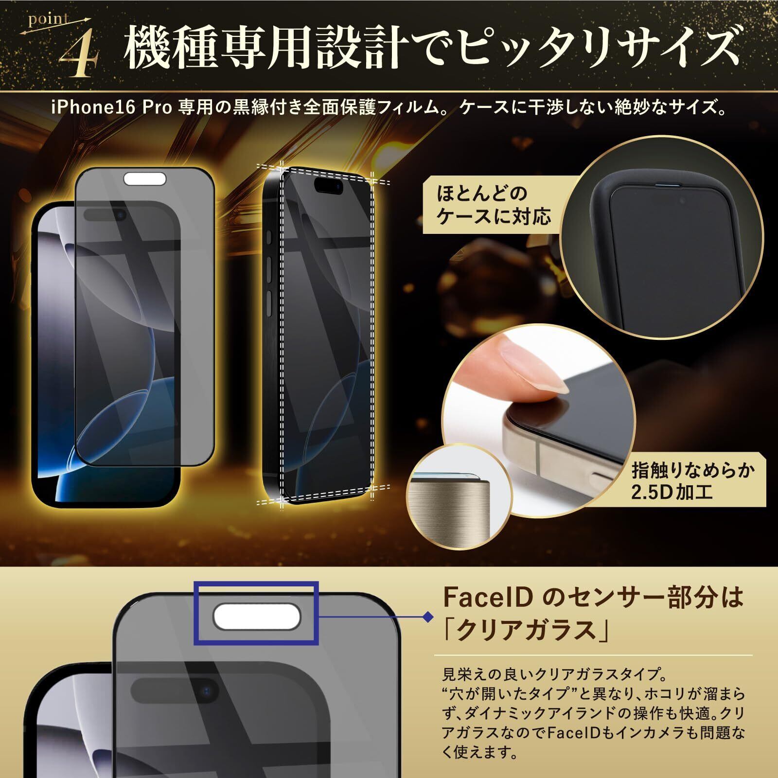 【対応機種】iPhone16Proに対応しています。【覗き見防止タイプ】視野角が左右約28°を超えると画面が暗くなり、プライバシーを守ります。黒縁付きの全面保護仕様です。※上下覗き見防止(360度)ではありません。【セット内容】アイフォン16プロ用のガイド枠付き強化ガラスフィルム×2、拭き上げキット×2、気泡除去用スクレーパー×1、説明書×1