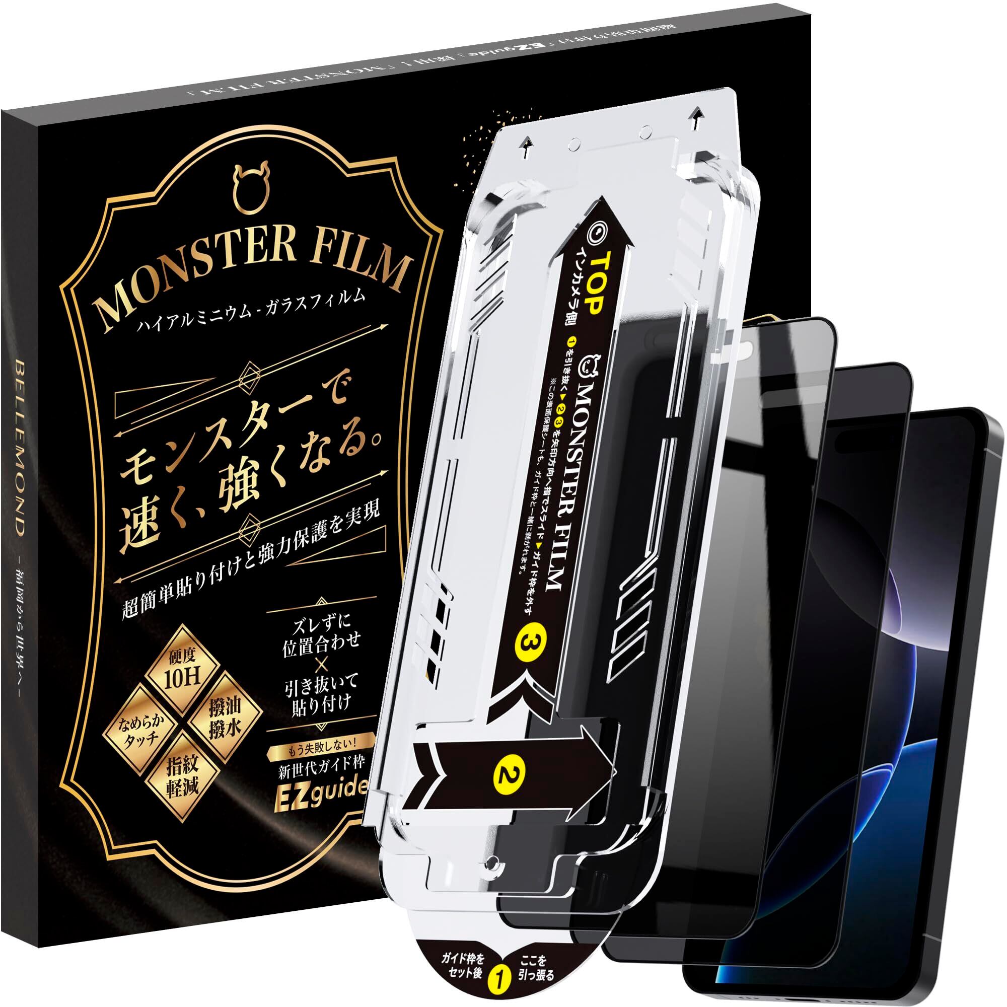 モンスターフィルム iPhone 16 Pro 用 覗き見防止 ガラスフィルム | 2枚セット ガイド枠付き 黒縁あり 全面保護 | のぞき見防止 貼りやすい アイフォン16 プロ 用 保護フィルム B1342