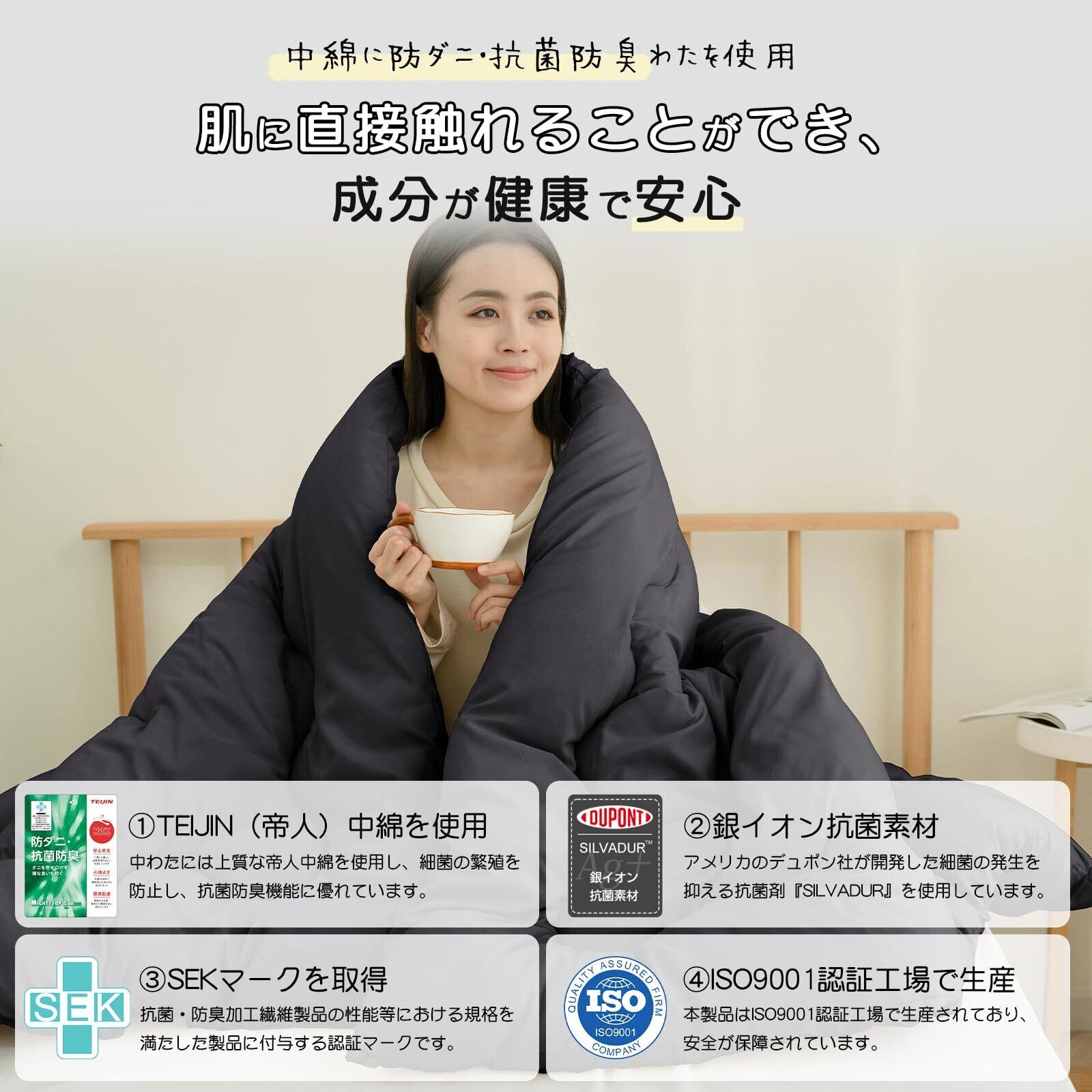 【抗菌・防臭・防ダニで清潔な布団】アメリカのデュポン社が開発した細菌の発生を抑える抗菌剤『SILVADUR』を使用し、布団の清潔さを長持ちさせます。布団生地が肌に長時間接触しても、清潔感を保ち続けられます。中わたには、防ダニ、抗菌、防臭効果抜群の『マイティトップII ECO』を使用。SEKマーク取得の抗菌防臭性能で、細菌の増殖を防ぎ、防臭効果を発揮します。