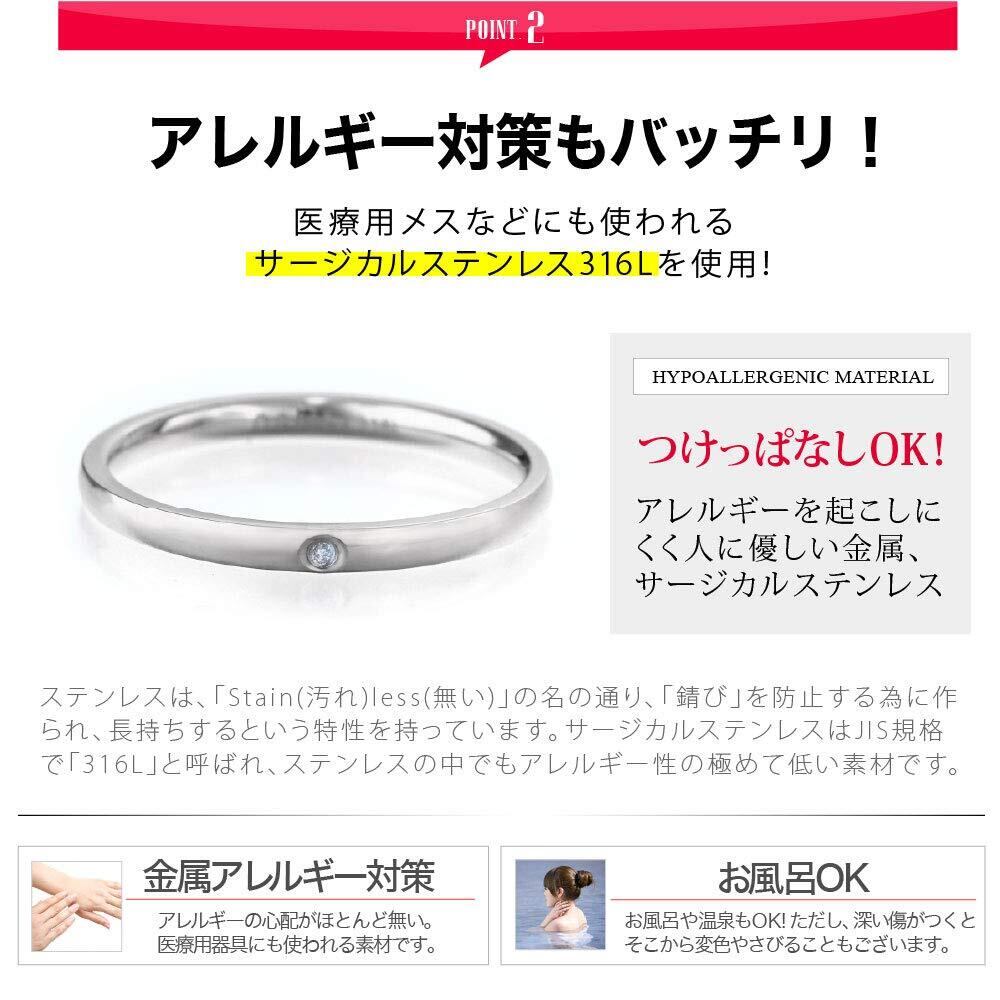 【素材】ステンレス【サイズ】ダイヤのサイズ1.2mm(0.005ct) 指輪の幅:2mm 指輪の厚み :1.4mm 重さ:1.2g (11号を測定)