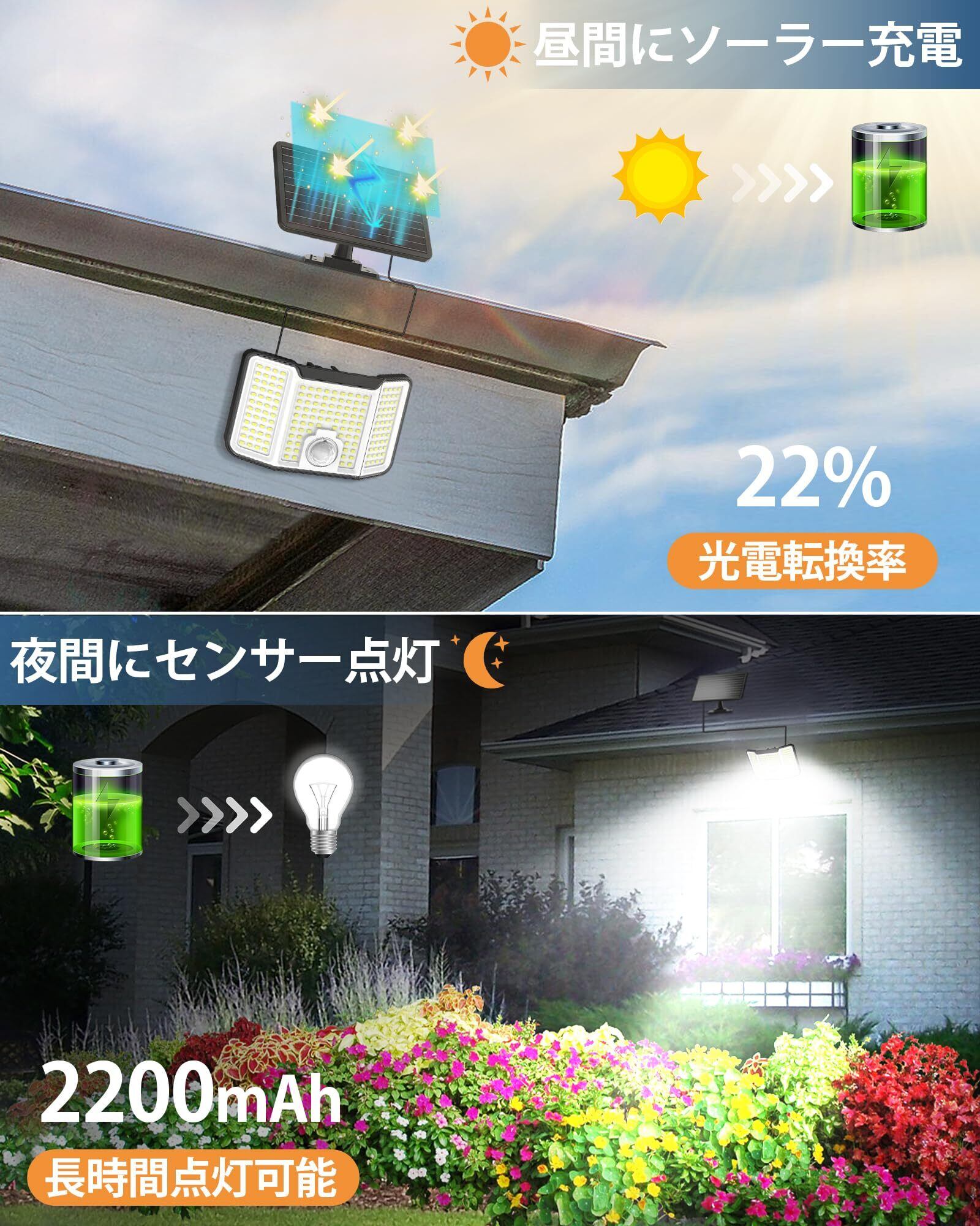 【2200mAh電池容量・電気代ゼロ!】大容量2200mAhのバッテリーが内蔵され、太陽光を6-8時間以上吸収して長時間連続照明が可能です。ソーラーライトは日中蓄えたソーラーエネルギーを使用するので電気代がかからず、お財布にも環境にも優しいです。防犯ライト、防災ライト、停電時自動点灯ライト、太陽光ledライト屋外は防犯や避難など場合も大活躍。