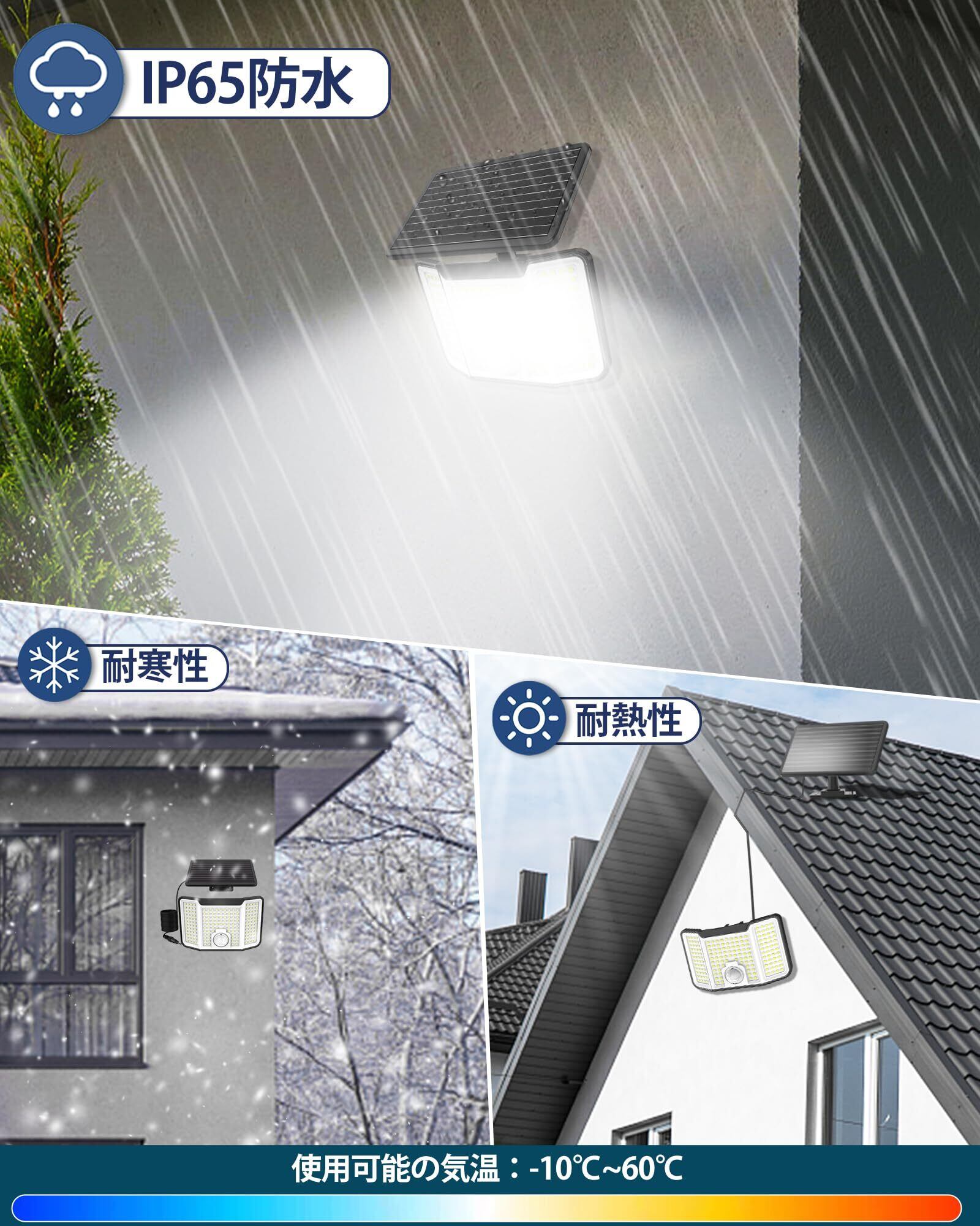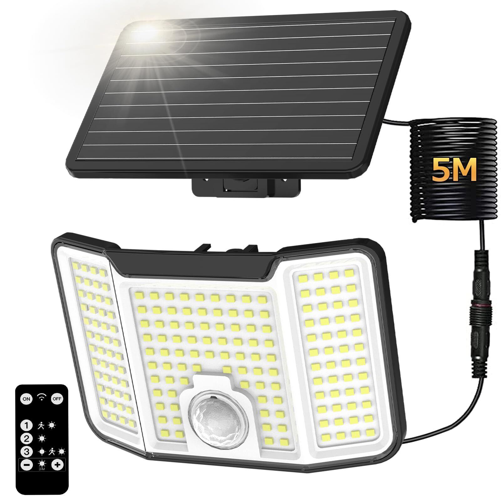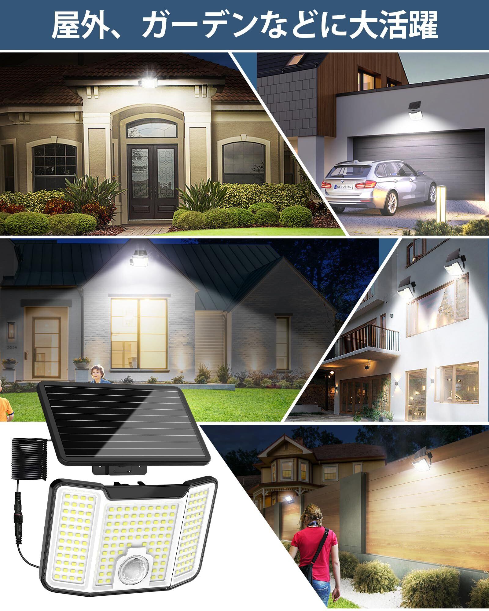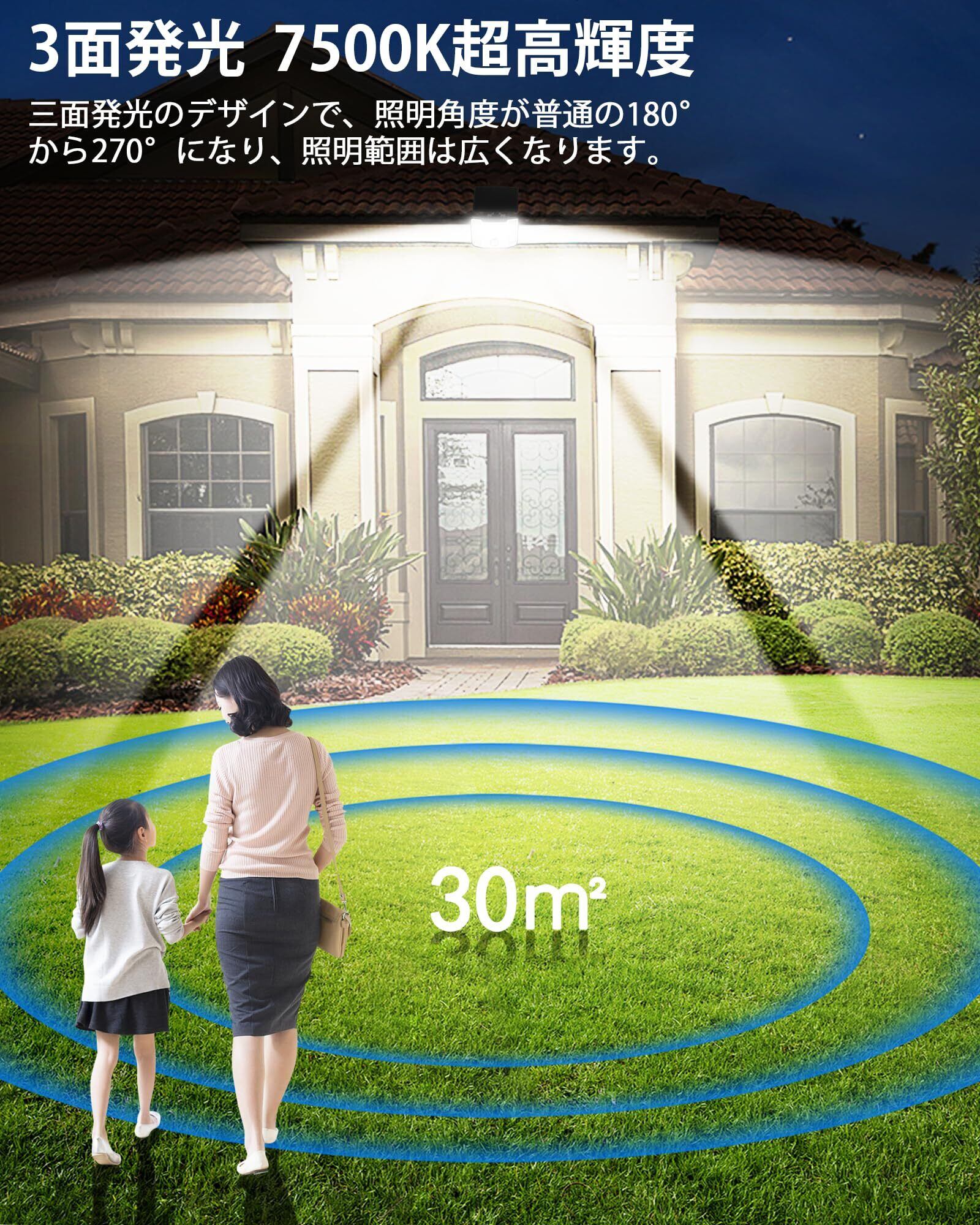 【171個高輝度LED、3面発光、270°照明】センサーライト屋外は171個超高輝度のLEDがあり、効率的で、照明効果に優れて、超明るく点灯できます。人感センサーライトは革新的な3面発光デザインを採用して、三面が同時照射可能です。270°照明角度が広範囲を照らし、明るさの超拡散を実現します。従来のソーラーライトと比べて、5メートルのケーブルを付きの分離型のセンサーライトは設置範囲が広くて、充電便利です。